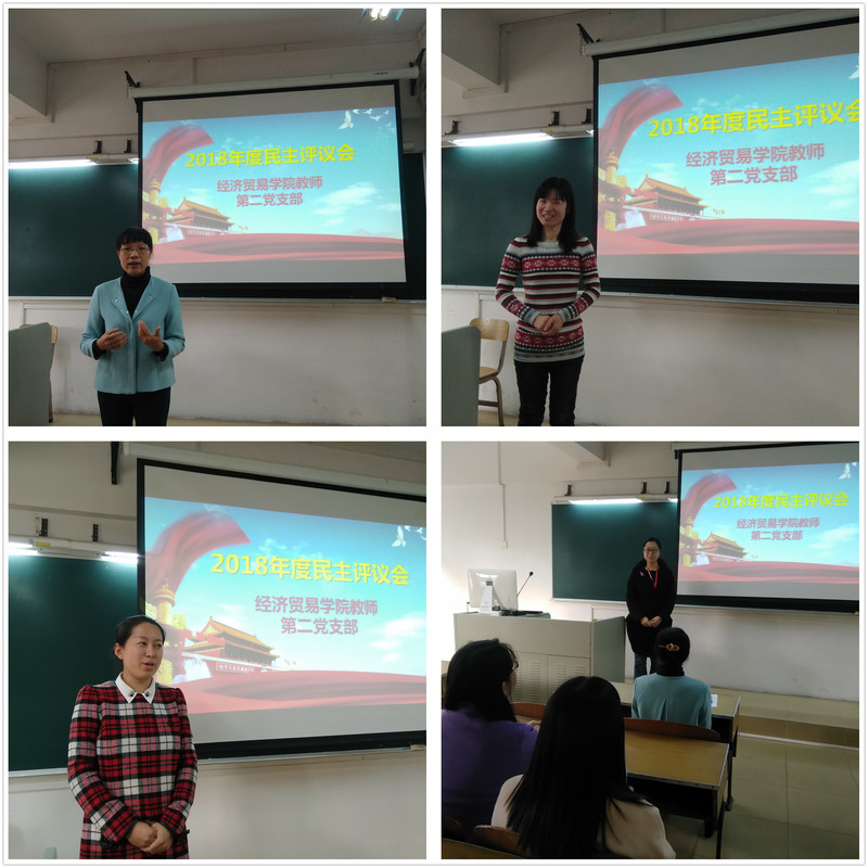 2019年1月11日下午3点,经贸学院教工第二党支部在西区综合楼401开展组织生活会暨民主评议会。经济贸易学院党总支副书记、院长邱秀芳同志,支部书记蒋晶同志,组织暨宣传委员张莉同志、纪检委员李文婷同志以及支部党员徐萌同志出席本次支部活动。