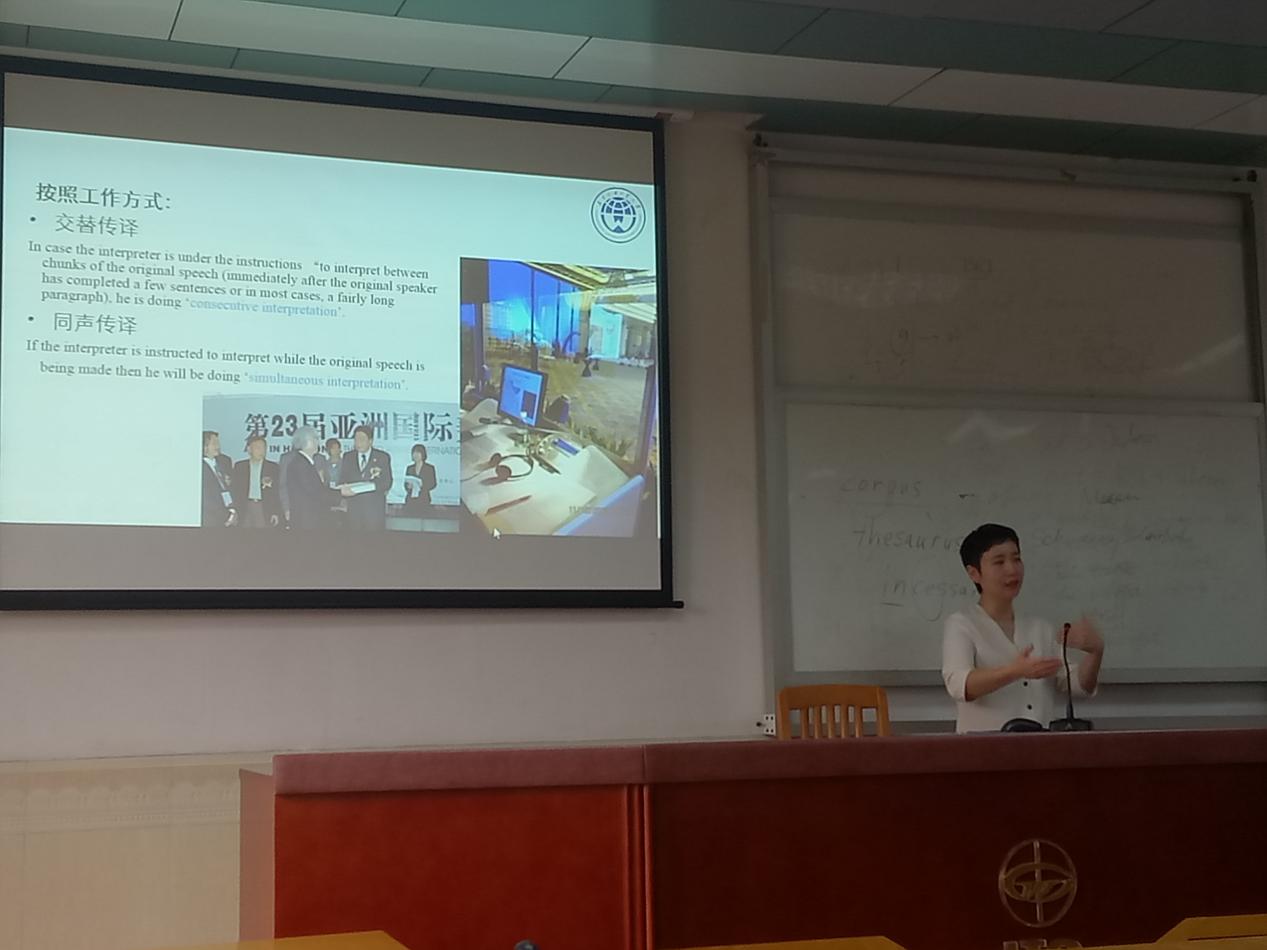 王老师先向同学们展示了广州翻译协会的性质、工作内容、日常活动等等,鼓励同学们加入该协会,学习更多关于口笔译的知识,获取更多当前社会上的口笔译工作资讯。同时,王老师也向同学们展示广外高翻学院的学生发展成果,讲解何为口笔译,如何学习口笔译,口笔译有哪些学习阶段,以及她对于译员的定位和理解。王老师强调说“就算你做了总统身边的译员,你也不应该自满,你的身份不会因为你做谁的译员而跟对方有多熟,要清楚自己始终是个译员,需要不断学习。”