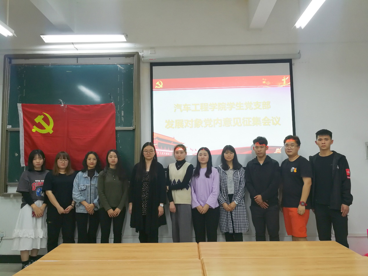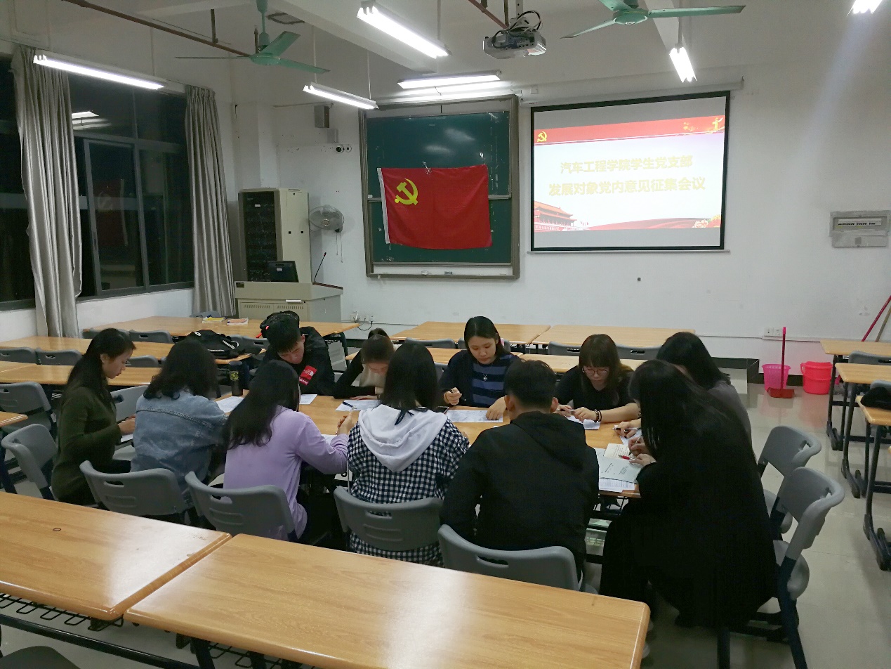 为学习贯彻习近平新时代中国特色社会主义思想、十九大会议精神和系列重要讲话精神,汽车工程学院学生党支部于2019年3月20日下午17点30分在明德楼1-415召开了关于本次发展党员的党内意见征集会议,本次会议由我院学生党支部书记刘彩云主持,与会人员为我院学生党支部全体在校党员。
