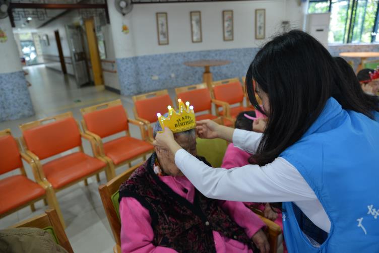 表演结束后,迎来大家最期待的环节——分蛋糕,随着生日快乐歌的响起,志愿者捧着蛋糕缓缓走进来。同时,志愿者们连同老人院的工作人员们一起祝贺老人们生日快乐,身体健康!