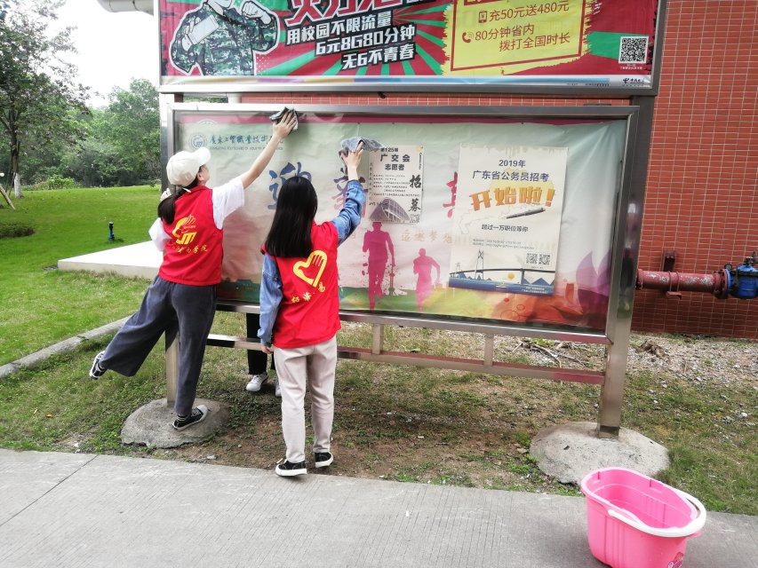 相比打扫校道的活动,清洗宣传栏是更有创新性的活动方式,宣传栏是一个很容易被同学们忽略的宣传工具,志愿者们没有忽略这个默默作贡献的宣传工具,齐力将宣传栏擦拭干净,使宣传栏焕然一新。