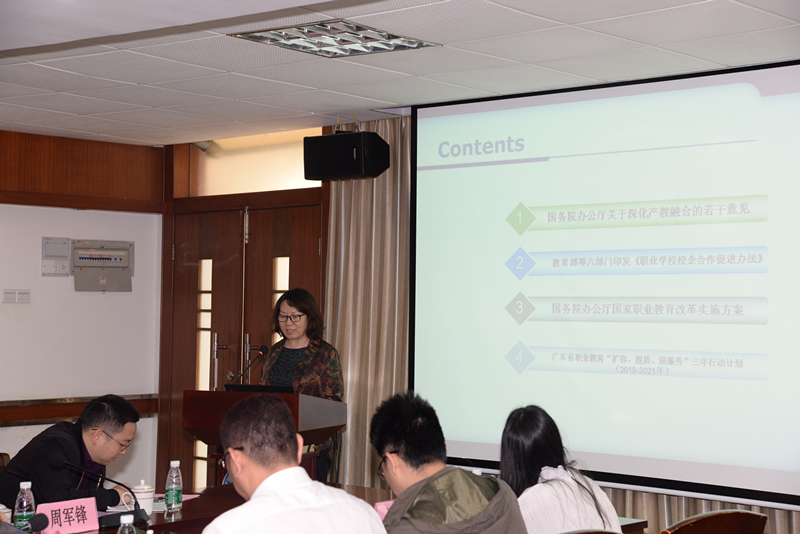 集团秘书长、学校副校长赵红为与会人员解读了《国务院办公厅关于深化产教融合的若干意见》、《国务院办公厅国家职业教育改革实施方案》、教育部等六部门印发《职业学校校企合作促进办法》和《广东省职业教育“扩容、提质、强服务”三年行动计划(2019-2021年)》等文件,深入分析了国家职业教育校企合作、产学研合作等政策精神。
