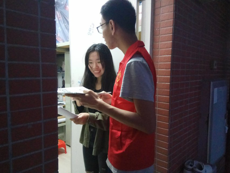 4月16日晚18:50,志愿者们在子勤书院⑤号楼架空层集合听负责人叙述扫楼的内容及注意事项后,19:00正式前往各楼层进行扫楼。志愿者们轻声敲门,礼貌地向同学们宣传此次摄影活动。