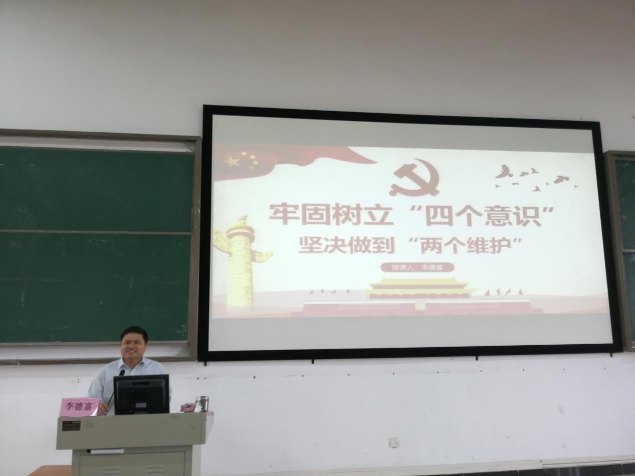 4月18日下午,应用外语学院党总支书记李德富以《牢固树立“四个意识” 坚决做到“两个维护”》为题作专题报告,为19年上半年发展对象上了一堂生动的党课。