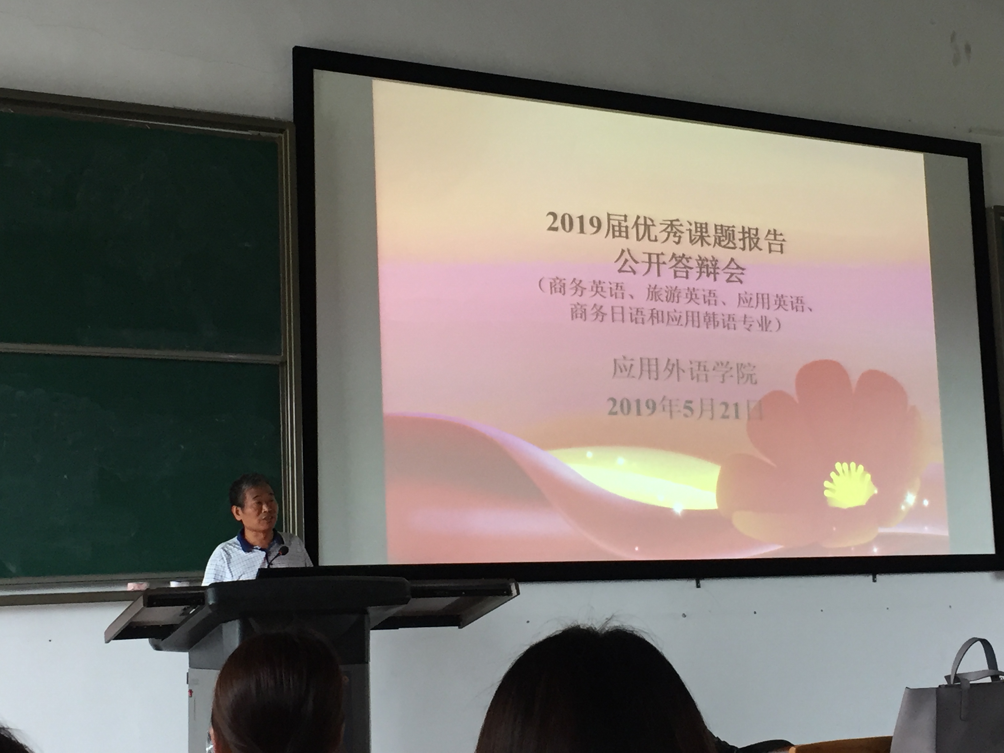 5月21日下午,应用外语学院在白云校区2-306教室顺利举行了“19届优秀毕业论文公开答辩会”。参加答辩的有来自商务英语、旅游英语、商务日语、应用韩语以及应用英语等五个专业的4名同学,应用外语学院副院长杨国民主持本次答辩会,邓国栋副院长以及外语学院其他部分专任教师作为答辩组成员出席了会议。此外来自不同年级的近300名外语学院学生和白云校区其他专业的同学进行了学习、观摩。