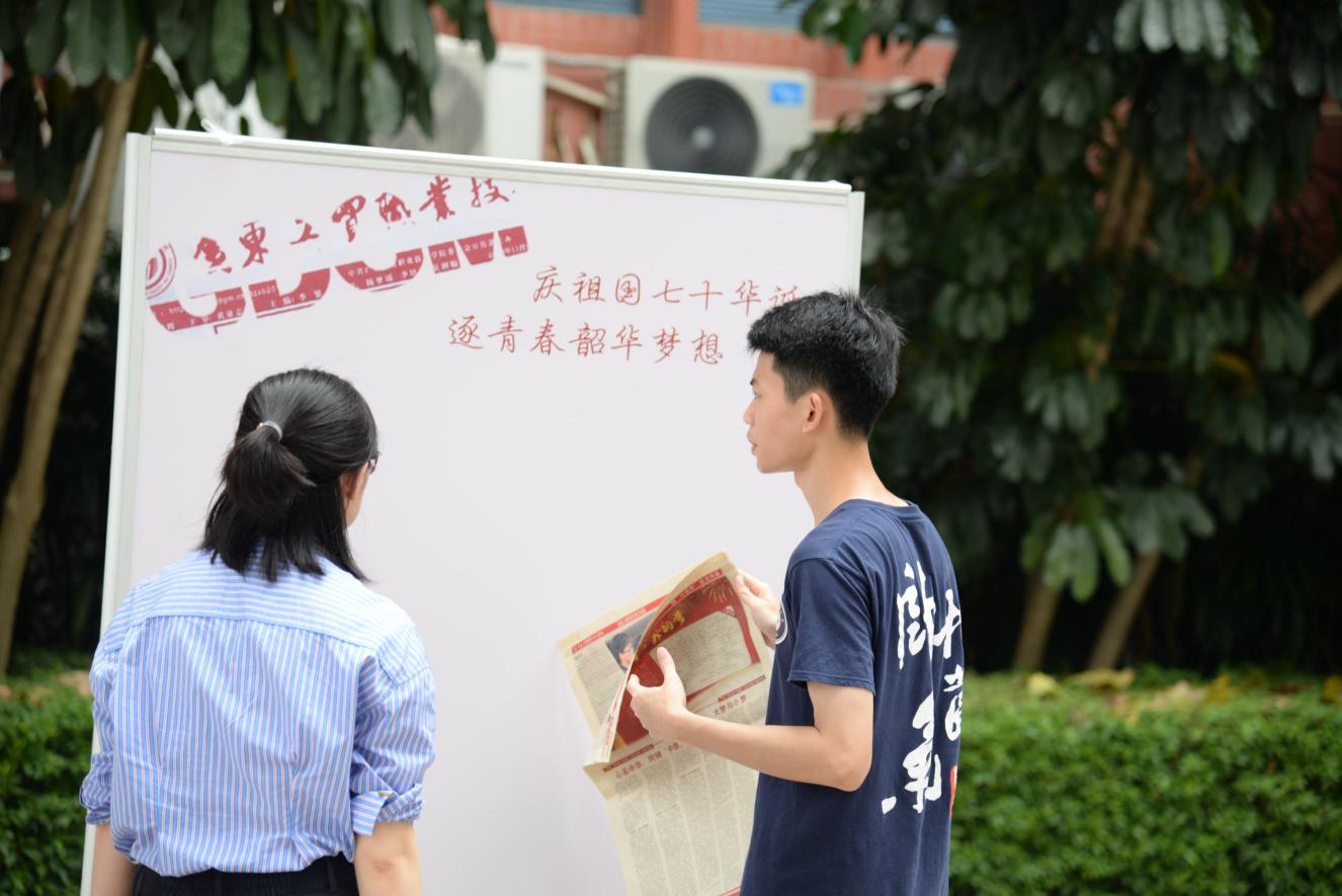 5月15日至5月17日,党委宣传部在白云校区校训广场和明德楼区域开展“庆中华人民共和国成立七十周年,逐青春韶华梦想”主题校报展活动。本次为期三天的校报展,通过展示记录学校建设历程的《广东工贸学院报》和展示祖国繁荣昌盛的中央、省委机关报,与广大师生一同回顾学校61年发展成就,一同庆祝中华人民共和国成立70周年。