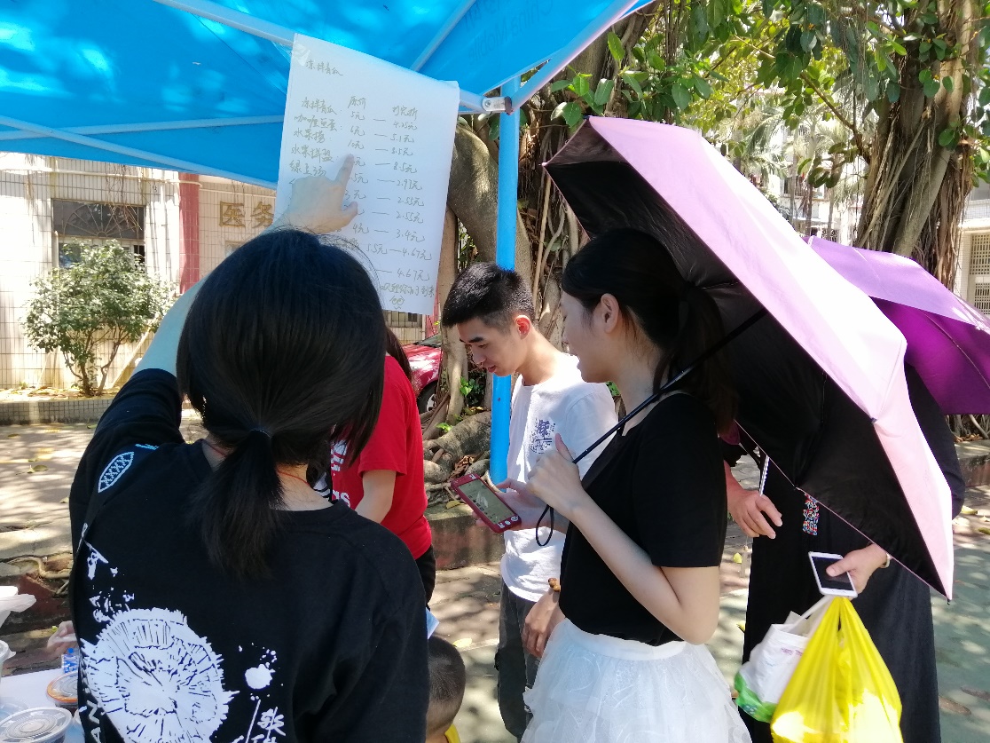 参与此次实践活动的商品可谓是琳琅满目,除了有各种各样的常见物品--水果冰、水果凉粉、携带式小风扇等,还有一些是与学生专业相关的物品,比如说来自18数艺1班的团支书林芝青带来了自己的亲笔力作--水彩贝壳画、水彩石头画和水彩木头画,这些极具有美感的作品立即吸引了无数的眼球,购买者称赞不绝。