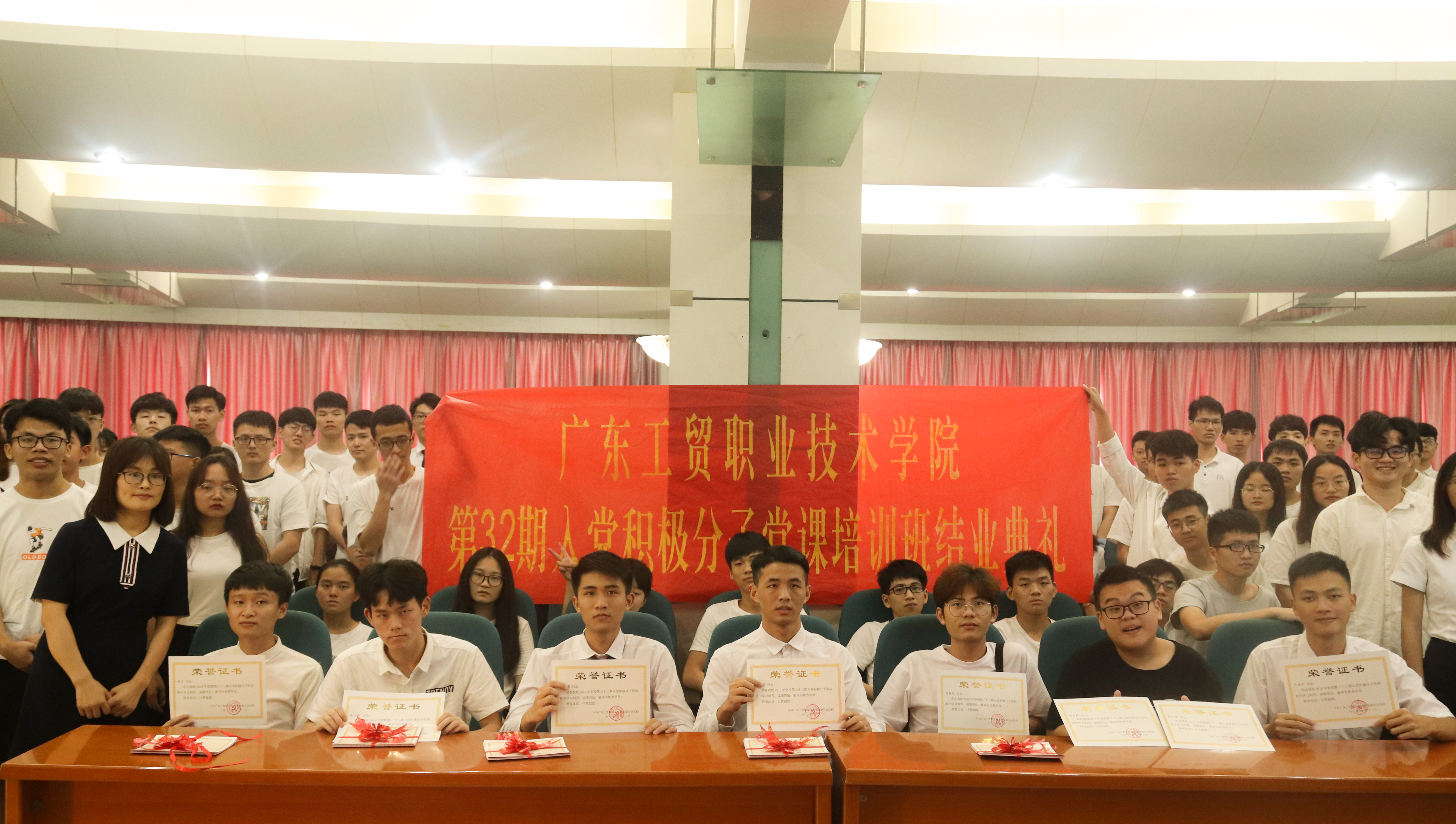 为做好发展党员工作,帮助广大入党积极分子系统地学习党的基本理论、基本知识,学习领悟习近平新时代中国特色社会主义思想和党的十九大精神,进一步提高入党积极分子的思想政治觉悟,端正入党动机,树立马克思主义世界观,坚定共产主义、社会主义理想信念。学校在2019年5月14日至6月11日举办了第三十二期入党积极分子党课培训班, 6月11日下午在学校报告厅开展了天河校区培训班的结业典礼,党委委员、学校办公室主任吴浩、计算机与信息工程学院党总支书记张宁、学生工作部副部长许斯华、团委副书记唐建树、计算机与信息工程学院党总支副书记张艳,典礼由张艳主持。