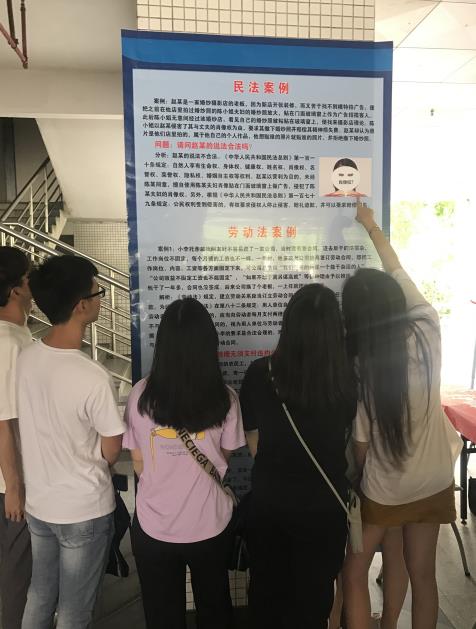 党的十九大明确要求“加大全民普法力度,建设社会主义法治文化,树立宪法至上、法律面前人人平等的法治理念”,为贯彻中央关于法律进社区、进学校的精神,进一步强化大学生知法、守法为核心的法律思维与意识;坚持理论性和实践性相统一,重视思政课的实践性,把思政小课堂同社会大课堂结合起来,增强大学生法治观念,实现全民普法,以推进依法治国方略的实施和构建社会主义和谐社会,营造良好的社会环境和法治氛围,马克思主义学院分别在2019年6月4日以及6月11日在天河和白云校区开展“逐青春韶华梦想,做依法治国践行者”的法律咨询暨主题党日活动。