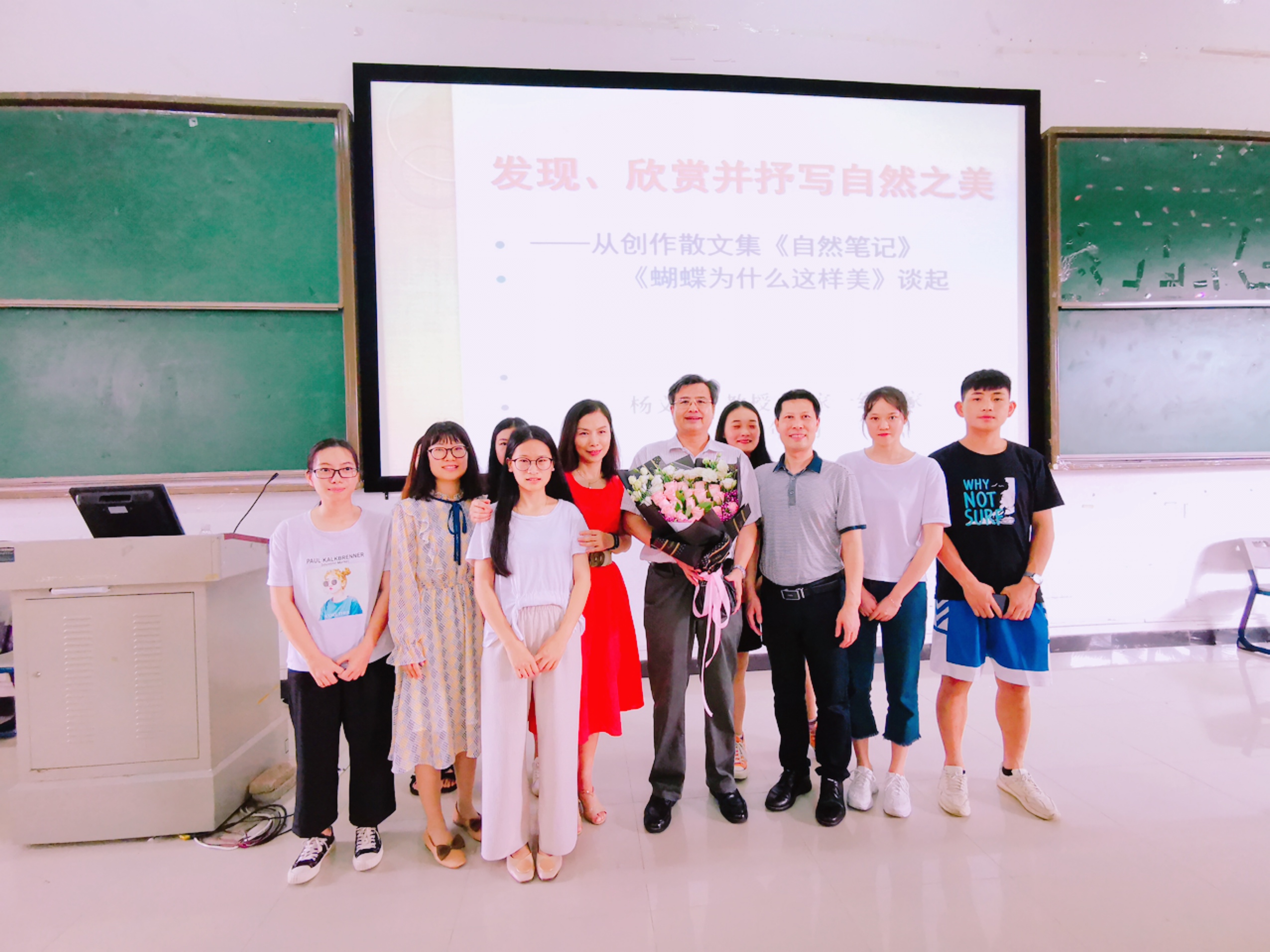 杨文丰教授以图文并茂的形式,向大家展示如何发现、感悟自然生态之美,并通过引领大家赏析《自然笔记》、《蝴蝶为什么这样美》等其创作的文章,告诉大家生态写作应如何切入,如何写才有意思有意义,最后还与大家分享了其自身的创作感悟以及创作体会,赢得了现场观众的满堂喝彩。互动环节,现场的同学们纷纷向杨教授提问,杨教授耐心地为同学们一一解答。近两个小时的讲座,同学们听得津津有味,纷纷表示受益匪浅、意犹未尽,同时也期待杨教授的再次到来。