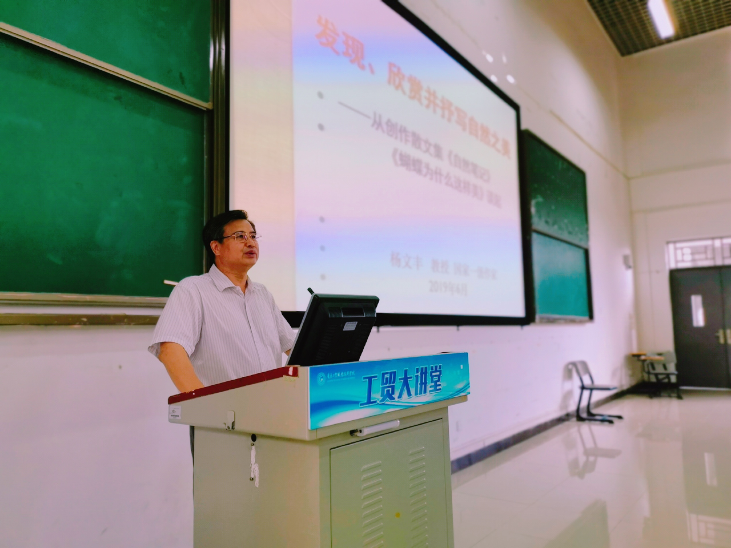 6月18日下午14:20,由学校党委宣传部和学生工作部联合主办的“工贸大讲堂”正式开讲。国家一级作家杨文丰教授应邀成为讲座首讲嘉宾,讲座主题为《发现、欣赏并书写自然之美——从创作散文集〈自然笔记〉〈蝴蝶为什么这样美〉谈起》,学生工作部部长刘建军、校友会办公室主任成海涛教授、党委宣传部副主任李繁等领导老师,以及200余名学生聆听了讲座,讲座由刘建军主持。