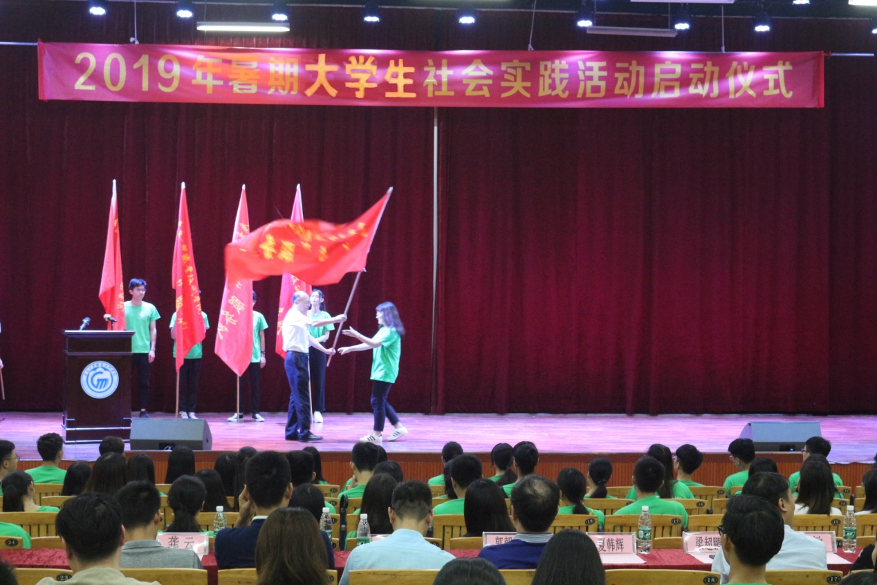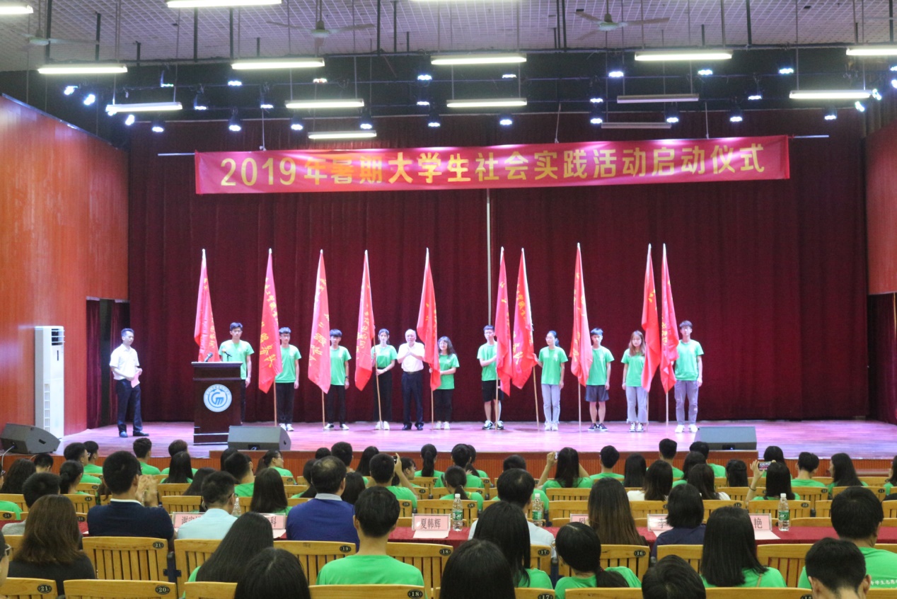 为引领教育我校青年学生勇做担当民族复兴大任的时代新人,以实际行动助力精准扶贫,服务乡村振兴战略,切实在感受改革开放40年取得的新成就新面貌的生动实践中受教育,努力成为“中国梦”的忠实践行者。2019年7月4日下午15点,团委在白云校区明德楼2区105演艺厅隆重举行“ 青春心向党 建功新时代”为主题的2019年大学生暑期社会实践活动启动仪式。学校党委副书记、纪委书记夏韩辉,校团委书记陈冠锋,应用外语学院党总支副书记罗春科,机电工程学院党总支副书记梁超鹏,测绘遥感信息工程系党总支副书记李元,汽车工程学院党总支副书记欧敏,工商管理学院党总支副书记谢宏祥,经济贸易学院党总支副书记龚云及300余名学生参加本次的启动仪式。