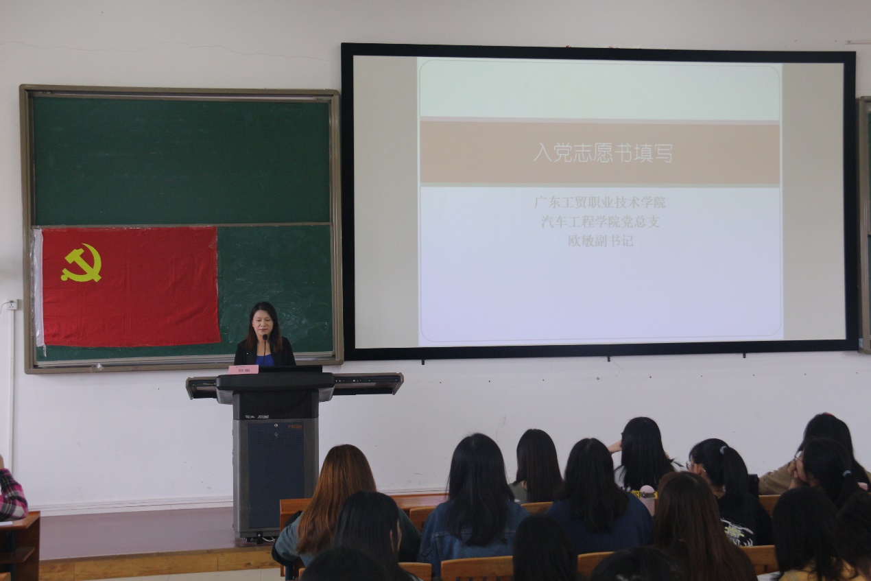 为深入贯彻落实《中国共产党发展党员工作细则》,做好党员发展工作,进一步提高发展对象的思想政治觉悟,坚定共产主义理想信念,端正入党动机,严格党员发展工作程序,保障党员发展质量。11月12日下午,汽车工程学院党总支副书记欧敏在白云校区明德楼2区306课室为2019年第二期发展对象进行入党志愿书填写培训。