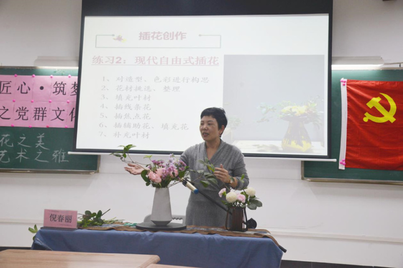 中国插花是中华传统文化艺术之一,历史悠久,风格独特。为了更好地建设三型党支部,弘扬中华民族文化,继承和发扬插花艺术。工商管理学院党群服务中心于2019年11月25日在明德楼2-703举行了第十九期党群文化汇《赏插花之美,品艺术之雅—插花艺术》。我们很荣幸邀请了资深花艺师倪春丽为此次文化汇的主讲人。