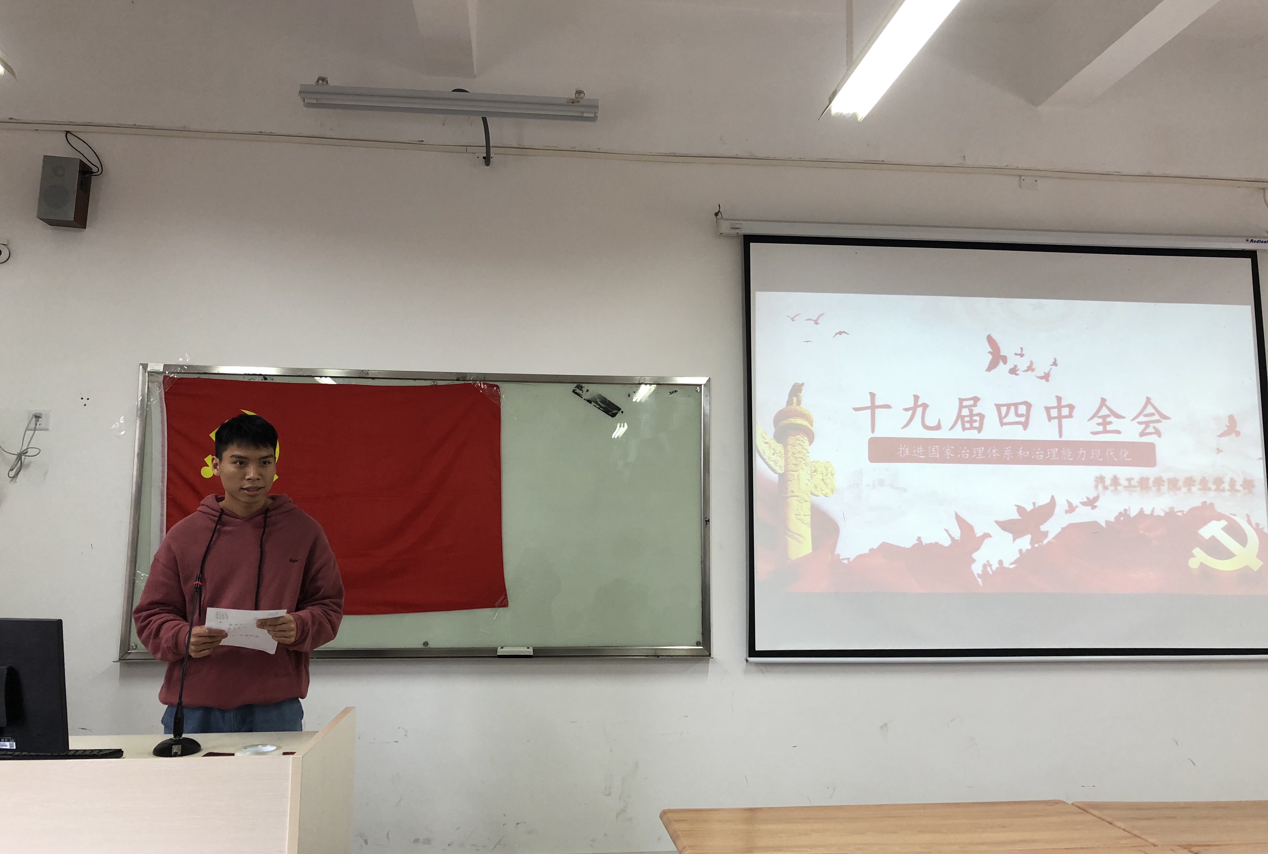 为了进一步深入学习贯彻党的十九届四中全会重要讲话精神,进一步深入了解坚持和完善中国特色社会主义制度、推进国家治理体系和治理能力现代化等一系列内容,进一步激发支部党员的初心意识,提高党员的使命担当和思想政治素养,2019年11月29日上午九点三十分,汽车工程学院学生党支部于教学楼1区410课室开展学习“党的十九届四中全会重要讲话精神”专题党课学习活动,此次学习由学生党支部书记刘彩云主讲。