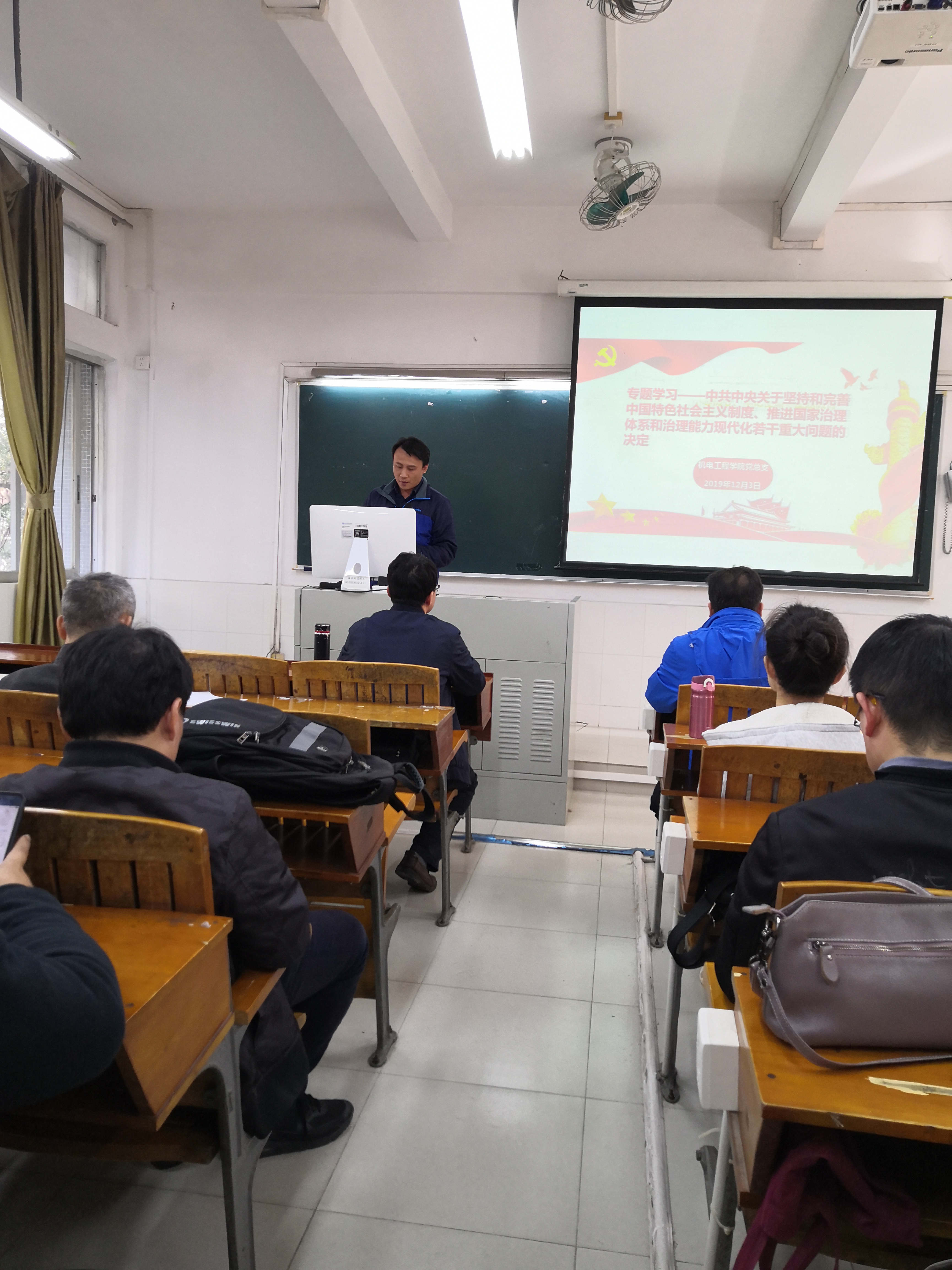 按照省委、省教育工委和学校党委有关通知要求,机电工程学院党总支在全院范围内,认真组织学习、宣传《中共中央关于坚持和完善中国特色社会主义制度、推进国家治理体系和治理能力现代化若干重大问题的决定》。12月3日,机电工程学院党总支在天河校区东区教学楼203召开了全体教师大会,集中学习《决定》精神,本次主题教育由机电工程学院党总支书记邵超城主持,参会人员为机电工程学院全体教师。