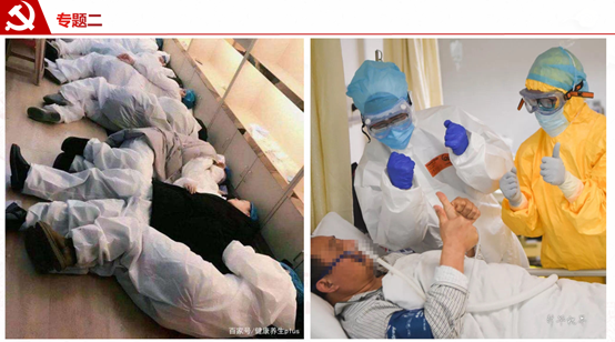 伟大时代呼唤伟大精神,打赢疫情防控“战斗”需要榜样引领。在专题二部分,大家共同学习了前线医护人员的模范事迹。特殊时期,党员先上,义不容辞,很多普通党员冲锋陷阵在抗“疫”第一线,构成了阻击疫情的红色防线。