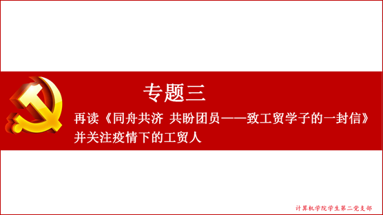 新型冠状病毒肺炎疫情,牵动着每一个人的心,党支部积极响应党中央和学校的号召,以“不负韶华,共克疫情”为主题,采取线下学习、线上交流的形式开展了这次特别的党课,深入学习了习近平总书记对本次疫情防控作出的重要指示,学习了在疫情中涌现出来的榜样人物事迹,再读了一次《同舟共济 共盼团员——致工贸学子的一封信》并一起关注疫情下工贸人的故事,最后同学们展开了讨论并分享了个人的思考与感悟。此次党课前,支部书记现将党课主题、ppt、上课要求等先通知了各位党员,要求大家提前准备,对学习的内容有所了解,提高了学习的效率和成效。