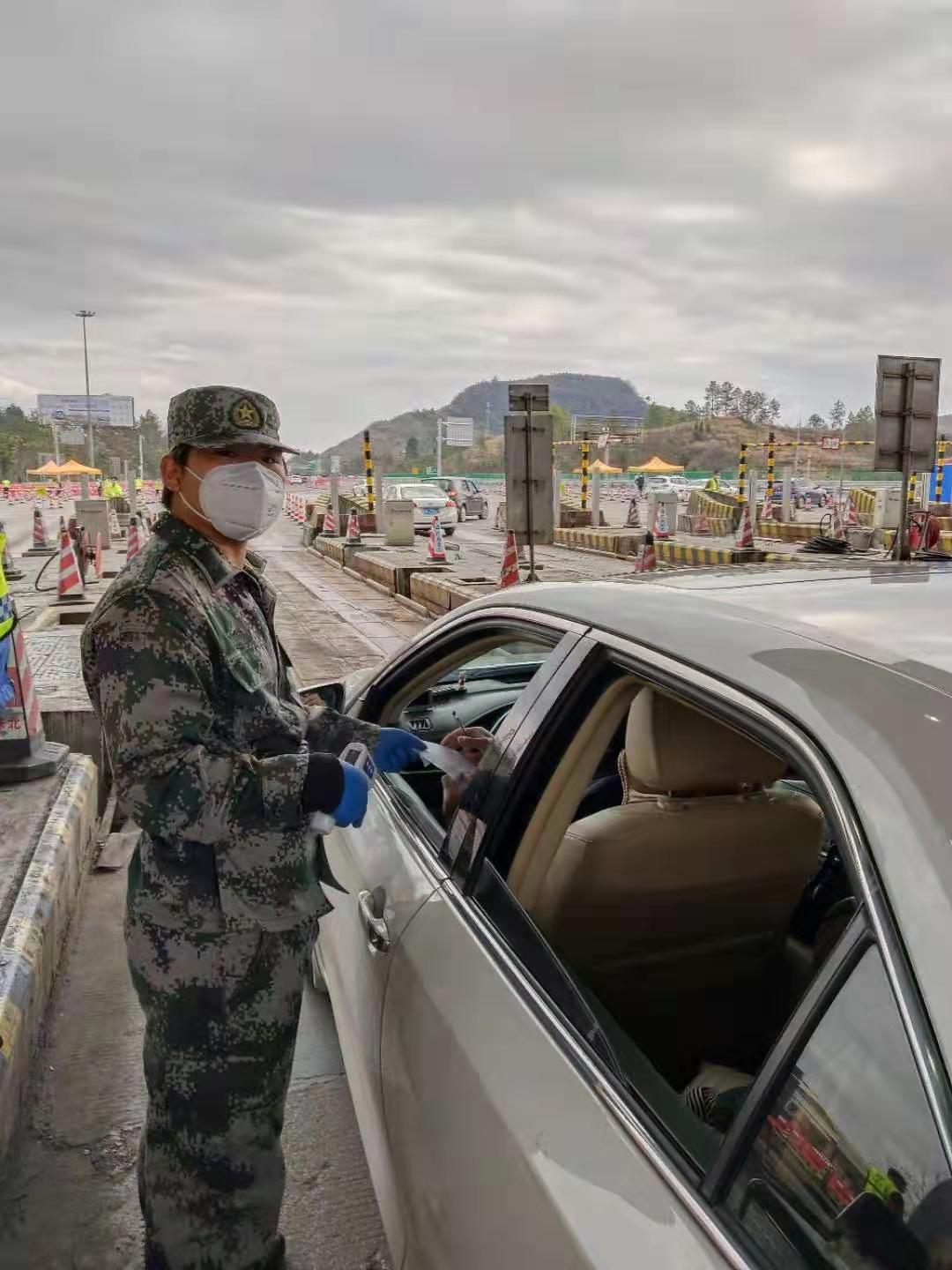粤北检查站地处韶关市,作为省界为拉起疫情防线,严防疫情蔓延,韶关市武装部抽调人员前往进行检查站守。19工测3班的退伍士兵付泽欢作为预备役应急民兵,贯彻落实上级对新型冠状病毒肺炎防疫工作的重要指示,“冲在第一线”赶往粤北检查站执勤抗击疫情。2月9日接到通知,一个小时到达集中点,凌晨上岗,他以最快的速度,奔赴抗疫之战的重要关口。时刻秉承“若有战,召必回”信念,国家需要,义不容辞。查车、检查车上成员体温、了解是否填写入粤登记......每台入粤车辆每个人都要检查询问仔细到位,这是每天的主要工作。轮班连续8个小时检查站守,加上气温骤降冷雨飘飘,工作简单但也重要且辛苦。对此付泽欢说:“身为退伍士兵,召之即来来之能战战之必胜,特殊时期再辛苦的工作都不算什么,只要大家都坚持下去,战‘疫’必胜。”