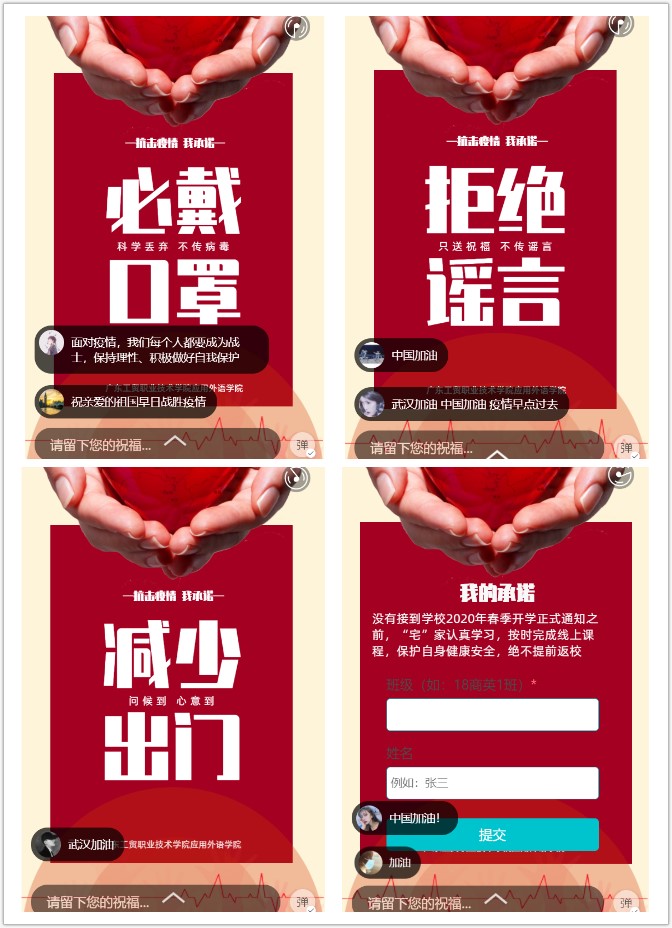 全民战“疫”,成就“最强防线”;科学防“疫”,筑牢“铁壁铜墙”。白衣天使、人民警察、社区工作者,在战场一线奋战,在城市守护平安,在社区筑起安全屏障。电子承诺书除了致敬每一位战“疫”前线的英雄外,还倡议同学们理性认识疫情,做好科学防护,不信谣,不传谣;居家生活,不随意外出,零串门、零聚会,最大限度的减少接触病毒的机会;每天向负责人报告个人健康状况,做到日报告、不隐瞒、不虚报;停课不停学,加强自我提升,做好假期规划,自主线上学习;在没有接到学校通知前,保证不提前返校,做遵纪校规的大学生。
