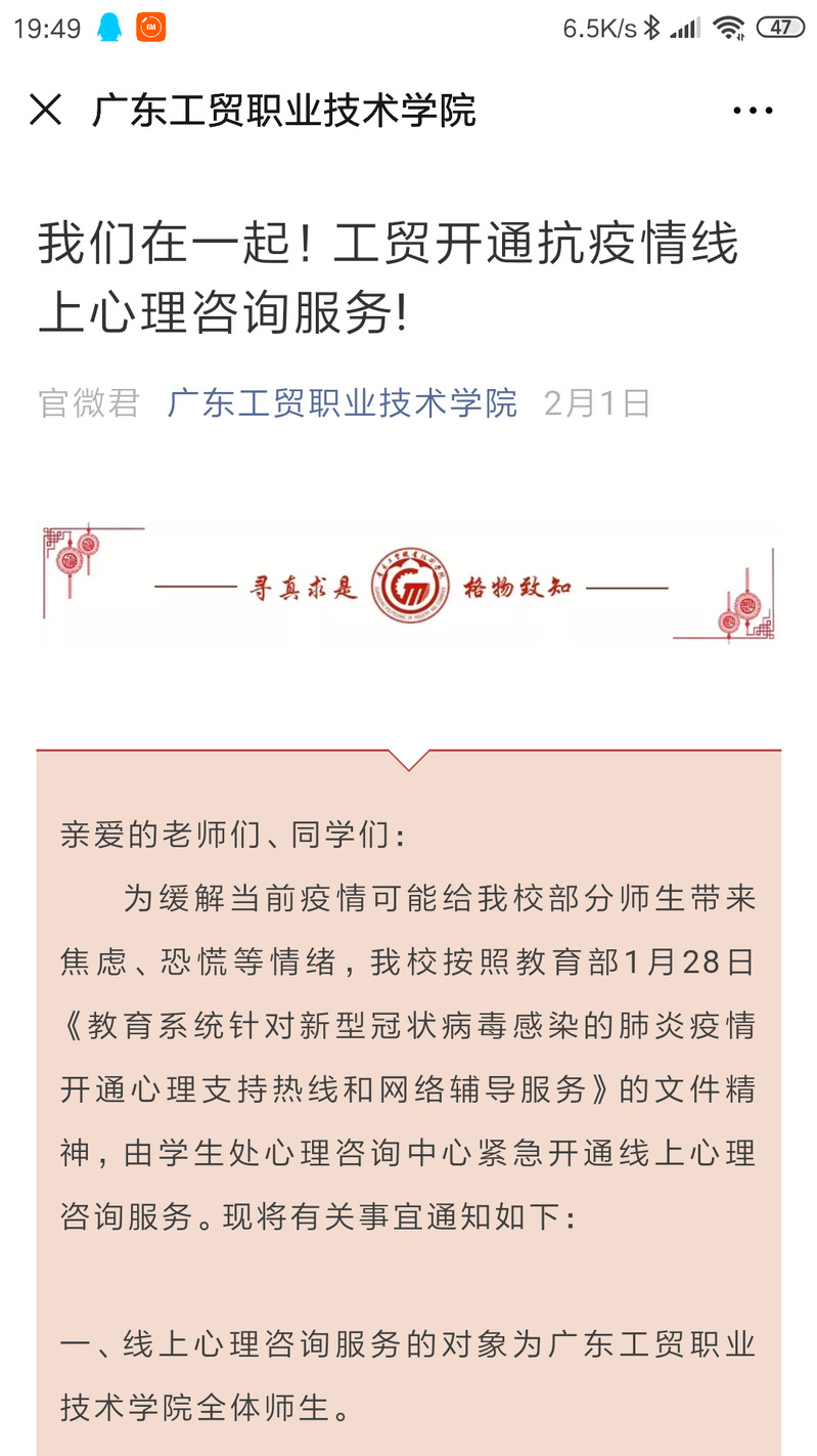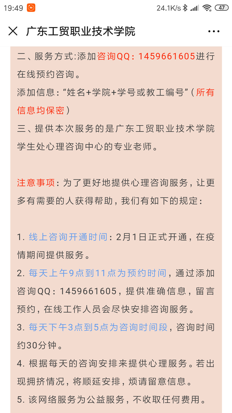 为有效帮助我校师生缓解和调整因疫情引起的负面情绪或心理困扰,增强自我调节能力,提升心理健康水平,心理咨询中心于2020年2月1日开通了线上心理咨询平台,中心教师轮流值班,秉承真诚、尊重、接纳、保密的原则,为全校师生提供一对一的线上心理咨询和危机干预服务。线上心理咨询服务值班安排已通知到班级群和每位同学,确保每位均知晓心理求助途径与方式,满足了同学们的心理求助需求。通过QQ心理咨询平台,中心的老师们为多位因疫情出现不良情绪的同学提供帮助,有效干预心理危机,为共同应对疫情用心出力。