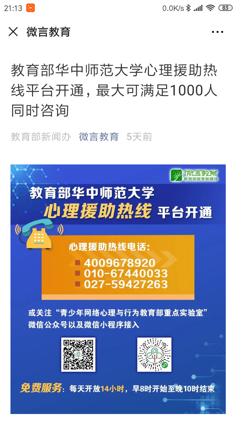 心理咨询中心龚伟志老师在做好学校线上咨询的同时,积极报名参加教育部华中师范大学心理援助热线平台的志愿服务,并自愿担任咨询小组长,努力熟悉咨询平台,积极参加案例督导,为其他咨询师提供协助,为援助热线提供力所能及的服务。该平台面向社会公众提供疫情相关的心理援助热线和网络支持服务,最大可满足1000人同时求助,每天开放14小时,早8时开始至晚10时结束。该平台特别面向以下三类人群提供精准心理援助:1、湖北省及武汉市防疫工作一线的医护人员;2、新冠肺炎患者及家属;3、公安干警及安保人员;4、同时面向公众提供服务。