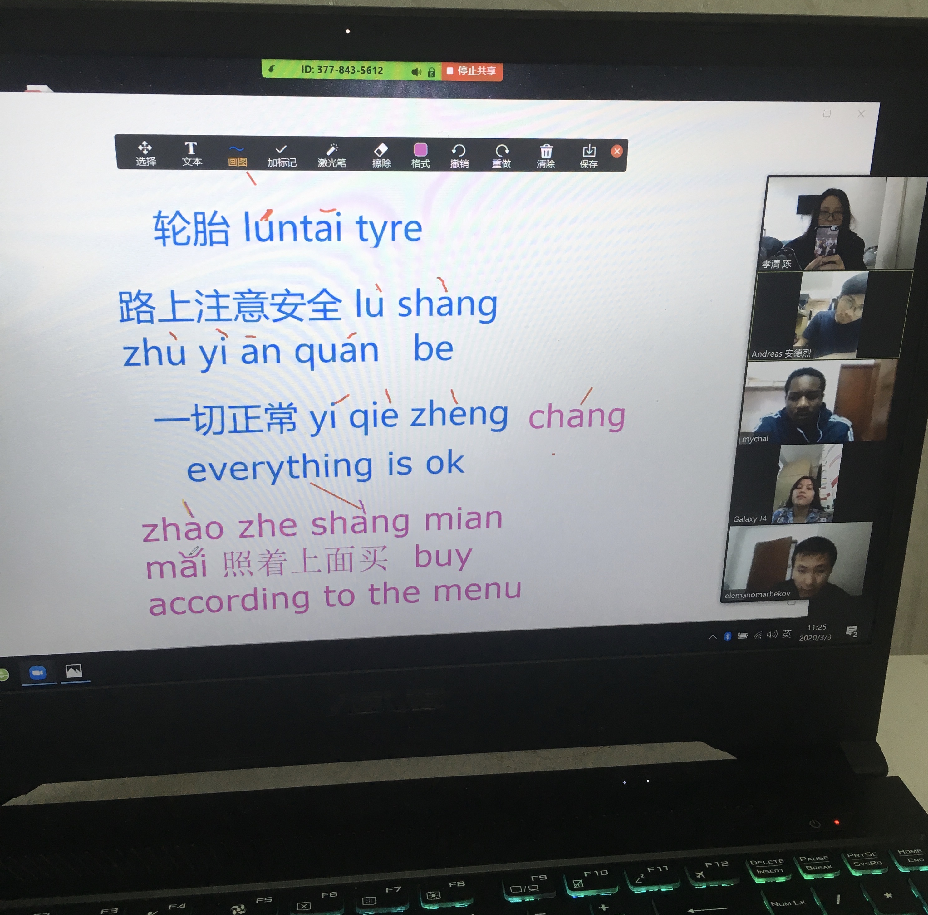 2020年春季第一课通过zoom软件进行学习。课堂上,老师向学生介绍新型冠状病毒的最新进展情况及防护措施,嘱咐留学生们做好安全防护。接下来,借助课件进行汉语听、说、读、写的专项练习。