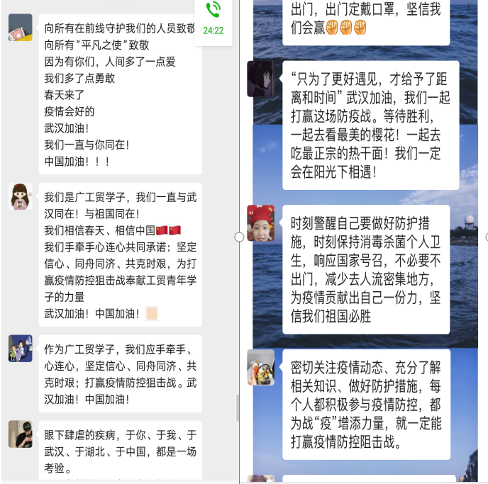 各类特色活动进一步活跃了团支部的学习氛围,也引起了大家的强烈反响。18电信3班郭文峰同学说的:“这次新冠病毒疫情阻击战,在习近平总书记的亲自指挥部署下,有关部门各司其职,部队官兵有力支援,医务人员英勇奋战,人民群众众志成城,已经出现积极变化,作为共青团员,更应该学习党中央的指示精神,听党话跟党走。相信在全国人民的奋力阻击下,这场战役终将胜利。”17数控3班施晓得说:“光明在前,中国能赢!我们在疫情面前,要放下恐慌,甩掉焦虑,做好个人保护,只要我们齐心协力,就没有翻不过的山;只要我们众志成城,就没有过不去的坎,让我们用胜利去迎接阳光明媚的春天。”