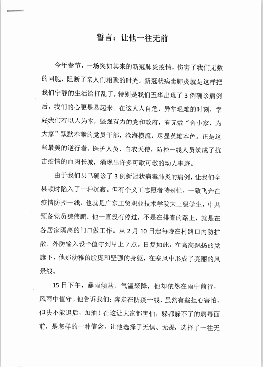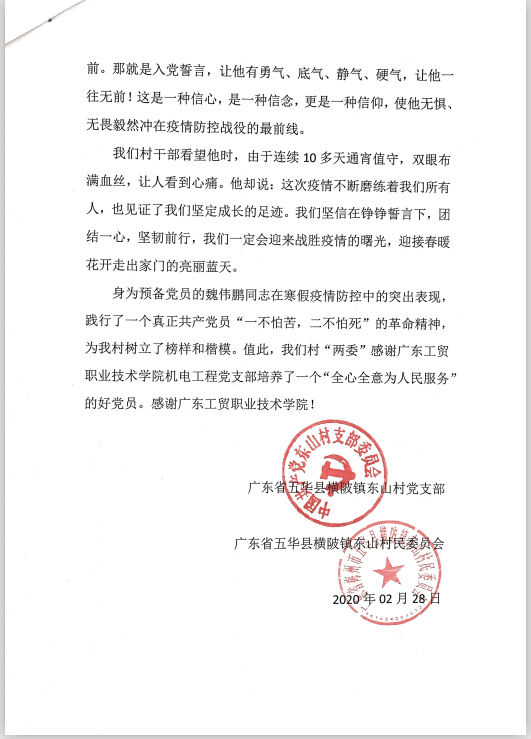 魏伟鹏,菲律宾亚星222官网机电工程学院学生第一党支部预备党员。在家乡五华县横陂镇东山村抗击新型冠状病毒肺炎疫情严峻态势下,该同志闻令而动、冲锋在前,入户登记排查、站点值班值守、测温控制人流、协调人员出入,以最坚定的意志、最顽强的作风,做好疫情防控的每一项工作,为坚决遏制疫情扩散蔓延势头、守护好人民群众生命健康,做了大量艰苦工作,付出了巨大努力。