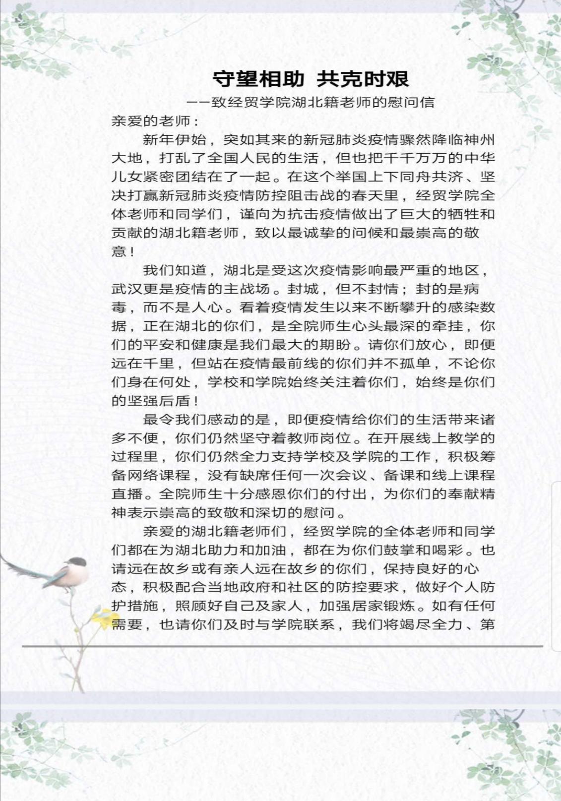 “全院师生将与你们同在,我们定能攻克难关,克服重重困难,赢得最终胜利,让我们共同期待着你们的平安归来,憧憬着回到学校团聚的那天,经贸学院永远是你们温暖的家。”