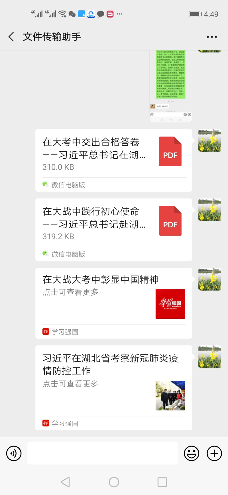 工商管理学院教师第一党支部的学习会在微信群上进行,由支部书记陈植乔带头发起,党员老师们在“学习强国”中进行相关资讯学习和分享,分别就党中央坚决打赢疫情防控阻击战制定哪些方针政策,如何贯彻执行进行了解,对目前疫情形势进行分析。重点学习了习近平总书记巡察湖北疫情期间的讲话内容和精神。