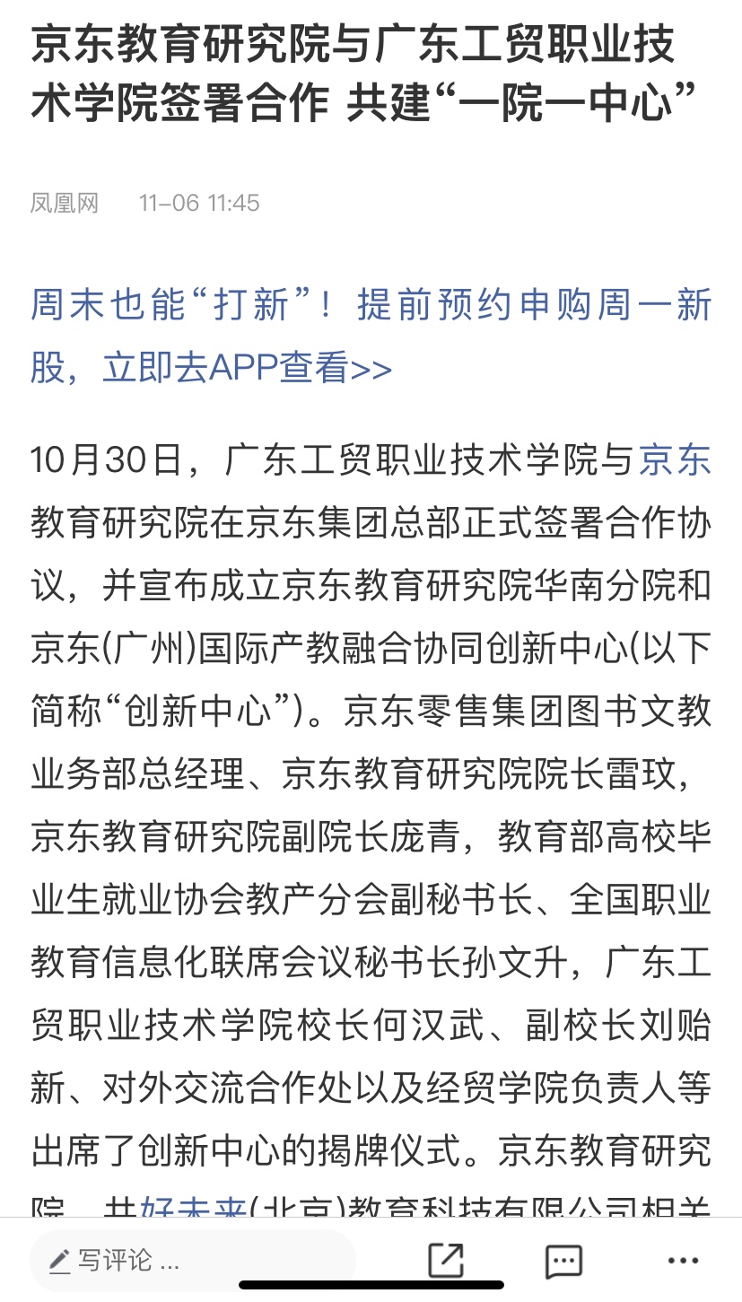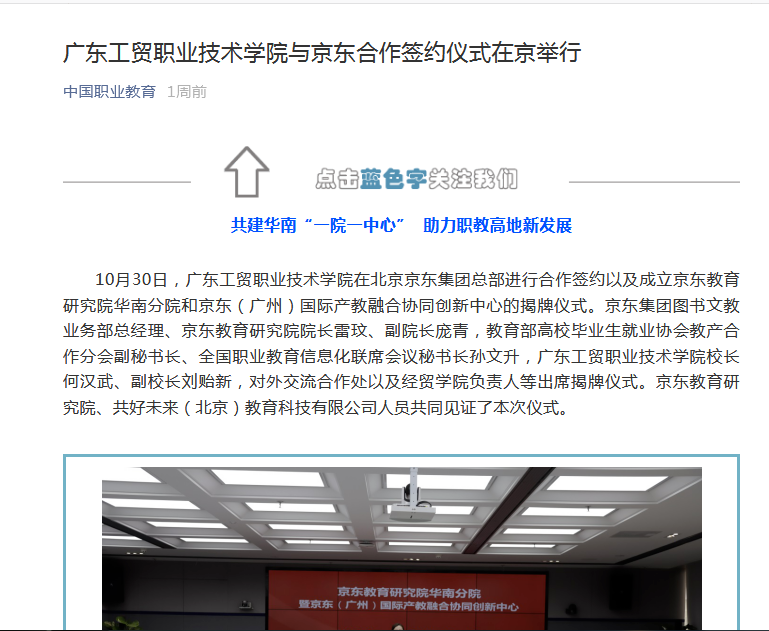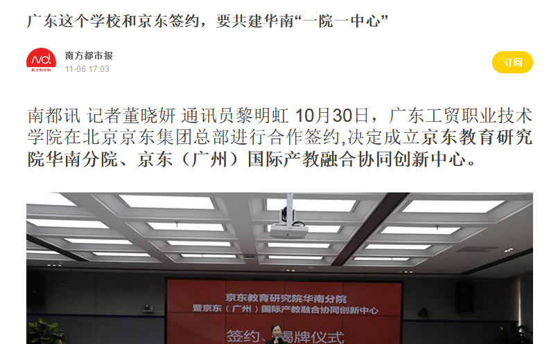 10月30日,我校在北京京东集团总部进行合作签约以及成立京东教育研究院华南分院和京东(广州)国际产教融合协同创新中心的揭牌仪式。此次京东集团与我校在广州共建“一院一中心”。“一院一中心”是京东集团教育板块在全国布局的五个分院之一和五个中心之一,结合我校的优质科研实力以及粤港澳大湾区经济和产业基础,双方将引入京东集团人工智能、大数据、无界零售、跨境电商等方面的人力与技术优势资源,实施产教对接对话,在职业教育产教融合、技术应用等方面进行创新性研究,在标准引领、教材研发、技术研发、赛项研究、技术服务、课题研究等领域产生一批有影响力的成果,打造电商、跨境电商、人工智能、大数据、云计算等行业引领的复合型国际化人才培养新高地,也标志着学校和世界500强企业的深度合作与融合,为实现职业教育领域的换道超车,共同打造华南地区电子商务、跨境电商及人工智能等职业教育新高地,培育和建设国家级产教融合试点工程和面向华南地区开展产教融合、校企合作的示范性载体,为职业教育发展贡献广东工贸-京东标准和中国方案。