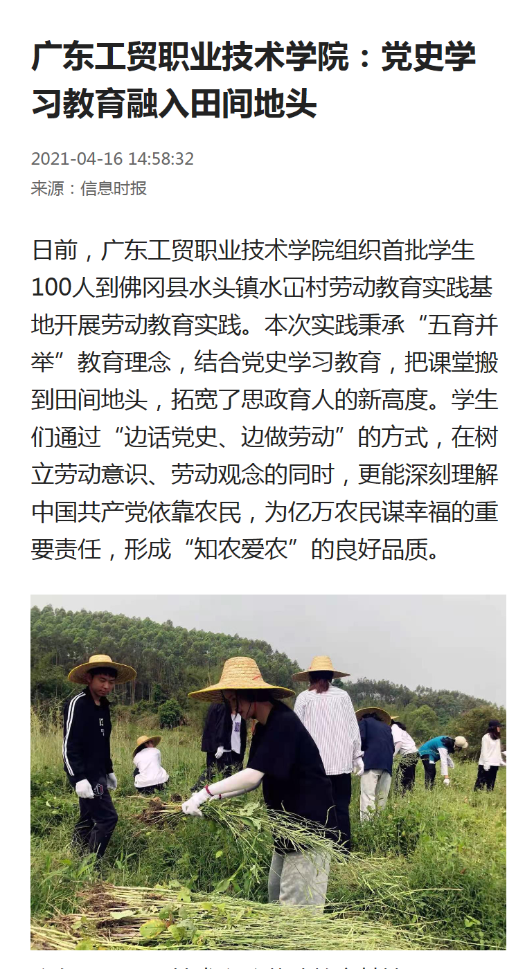 日前,我校组织首批学生100人到佛冈县水头镇水冚村劳动教育实践基地开展劳动教育实践。本次实践秉承“五育并举”教育理念,结合党史学习教育,把课堂搬到田间地头,拓宽了思政育人的新高度。学生们通过“边话党史、边做劳动”的方式,在树立劳动意识、劳动观念的同时,更能深刻理解中国共产党依靠农民,为亿万农民谋幸福的重要责任,形成“知农爱农”的良好品质。