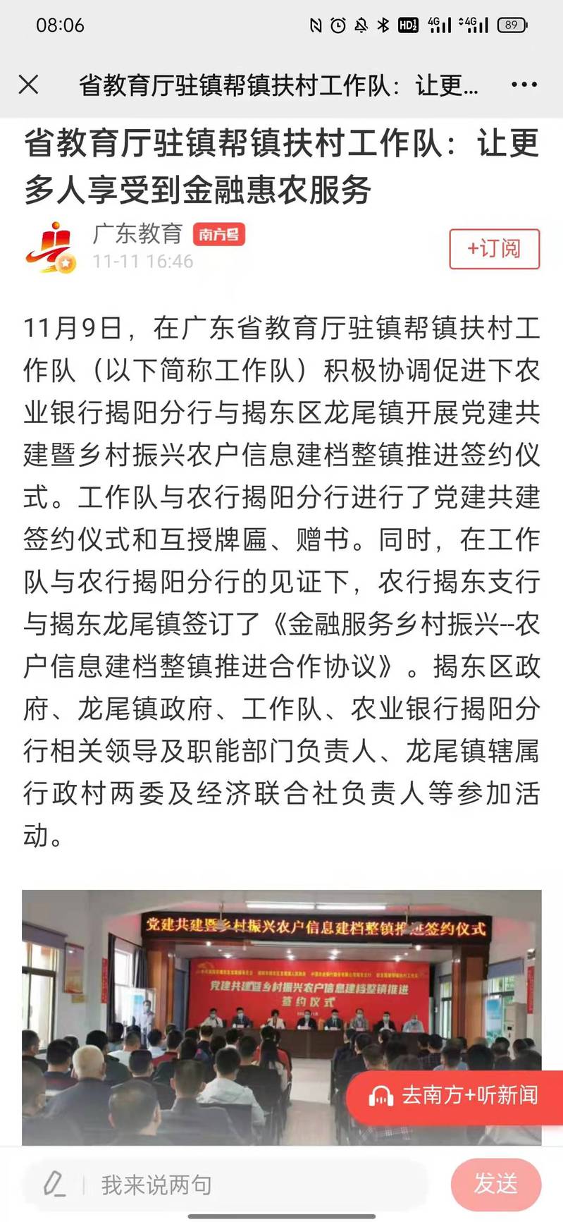 在广东省教育厅驻镇帮镇扶村工作队(以下简称工作队)积极协调促进下农业银行揭阳分行与揭东区龙尾镇开展党建共建暨乡村振兴农户信息建档整镇推进签约仪式。工作队与农行揭阳分行进行了党建共建签约仪式和互授牌匾、赠书。同时,在工作队与农行揭阳分行的见证下,农行揭东支行与揭东龙尾镇签订了《金融服务乡村振兴--农户信息建档整镇推进合作协议》。