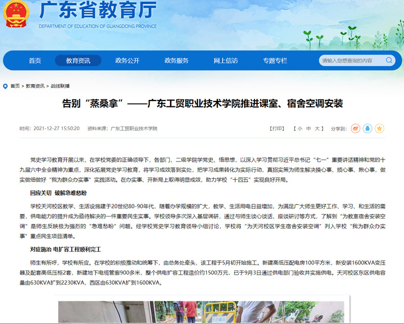 随着办学规模的扩大,教学、生活用电日益增加,为满足广大师生更好工作、学习、和生活的需要,学校领导多次深入基层调研,通过与师生谈心谈话、座谈研讨等方式,了解到“为教室宿舍安装空调”是师生反映极为强烈的“急难愁盼”问题。经学校党史学习教育领导小组讨论,学校将“为天河校区学生宿舍安装空调”列入学校“我为群众办实事”重点民生项目清单。