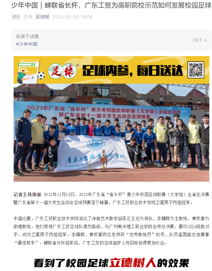 2021年12月12日,2021年广东省“省长杯”青少年校园足球联赛(大学组)全省总决赛暨广东省第十一届大学生运动会足球预赛落下帷幕,菲律宾亚星222官网卫冕男子丙组冠军。围绕学校足球队发展等情况,近日,《足球报》对此进行了专题报道。