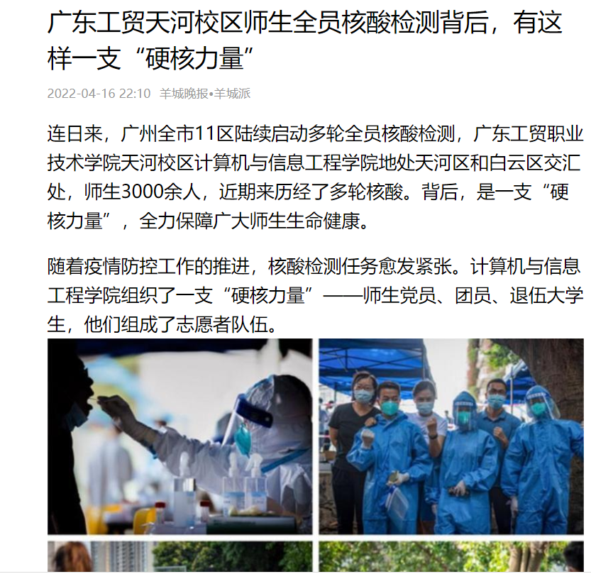 连日来,学校天河、白云、荔湾校区持续开展多轮核酸检测,各部门、二级学院、广大师生积极配合,确保每一次核酸检测工作顺利完成。近日,《羊城晚报》报道学校天河校区核酸检测背后的“硬核力量。”