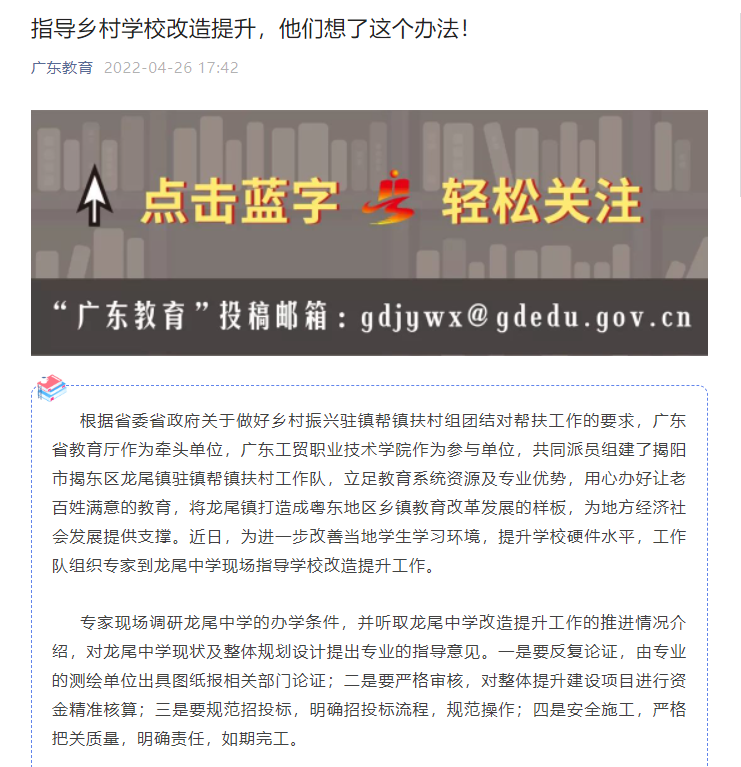 广东省教育厅作为牵头单位,菲律宾亚星222官网作为参与单位,共同派员组建了揭阳市揭东区龙尾镇驻镇帮镇扶村工作队,立足教育系统资源及专业优势,用心办好让老百姓满意的教育,将龙尾镇打造成粤东地区乡镇教育改革发展的样板,为地方经济社会发展提供支撑。