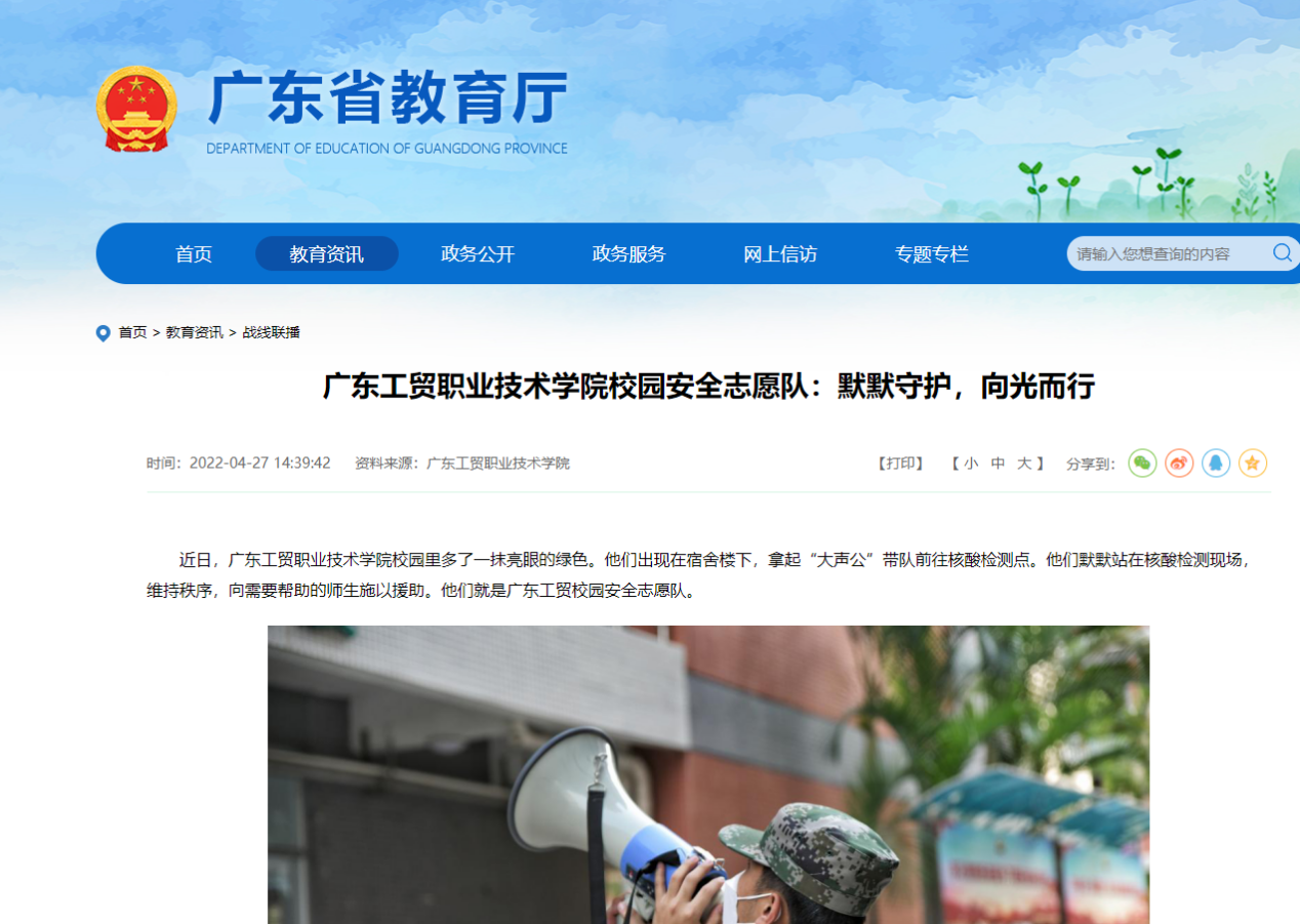 近日,学校校园里多了一抹亮眼的绿色。他们出现在宿舍楼下,拿起“大声公”带队前往核酸检测点。他们默默站在核酸检测现场,维持秩序,向需要帮助的师生施以援助。他们就是广东工贸校园安全志愿队,积极助力学校每一次核酸检测工作。