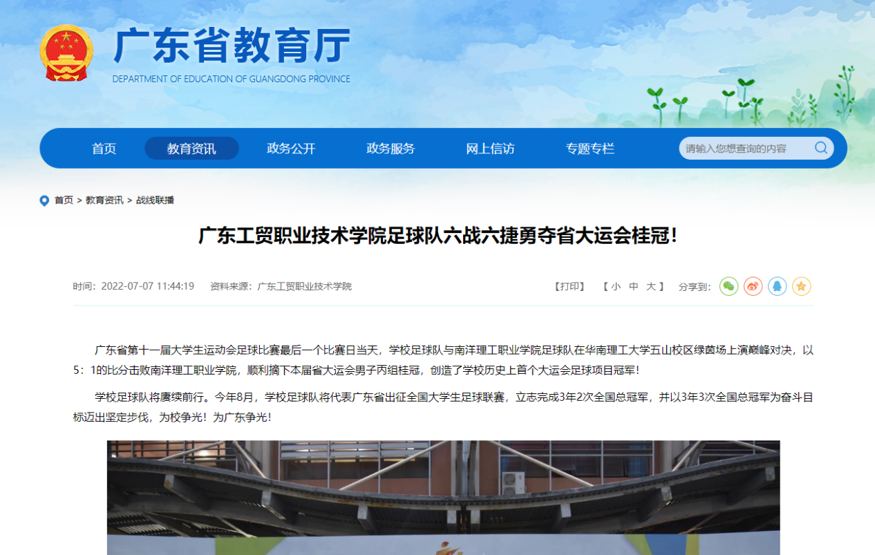 广东省第十一届大学生运动会足球比赛最后一个比赛日当天,学校足球队与南洋理工职业学院足球队在华南理工大学五山校区绿茵场上演巅峰对决,以5:1的比分击败南洋理工职业学院,顺利摘下本届省大运会男子丙组桂冠,创造了学校历史上首个大运会足球项目冠军!