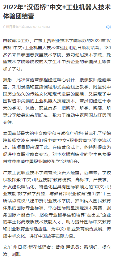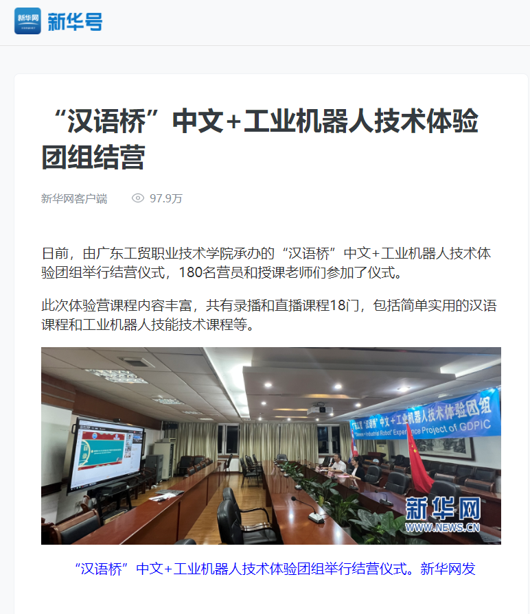 近日,由教育部主办、学校承办的2022年“汉语桥”中文+工业机器人技术体验团组顺利结营。在这期间,学校作为示范院校助力提升国际中文教育和职业教育全球适应性,为中文+职业教音融合发展、传播中华文化、讲好中国故事、促进中外民心相通和“中文+职业技能”教育高质量发展出了一份力。