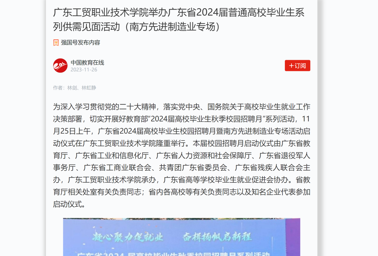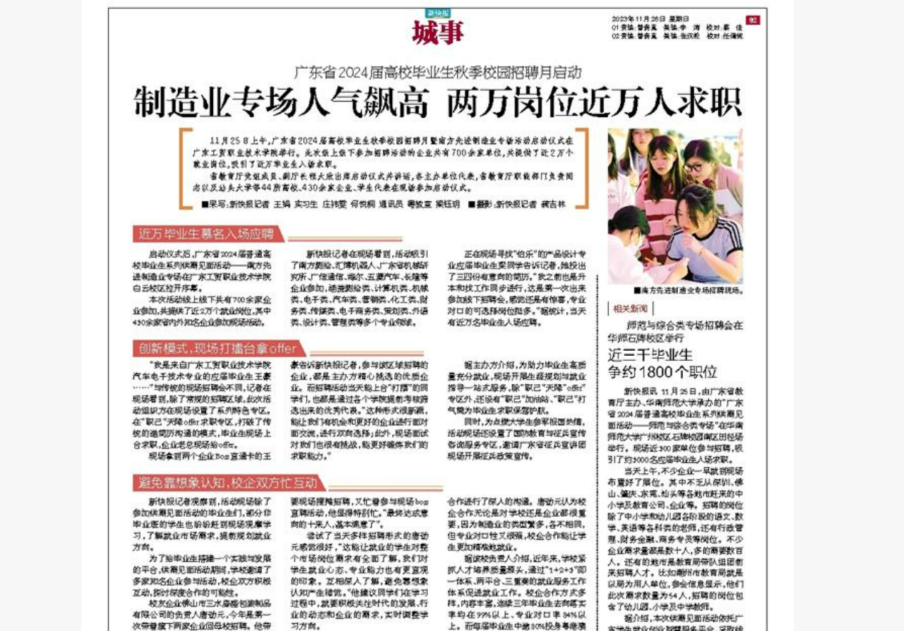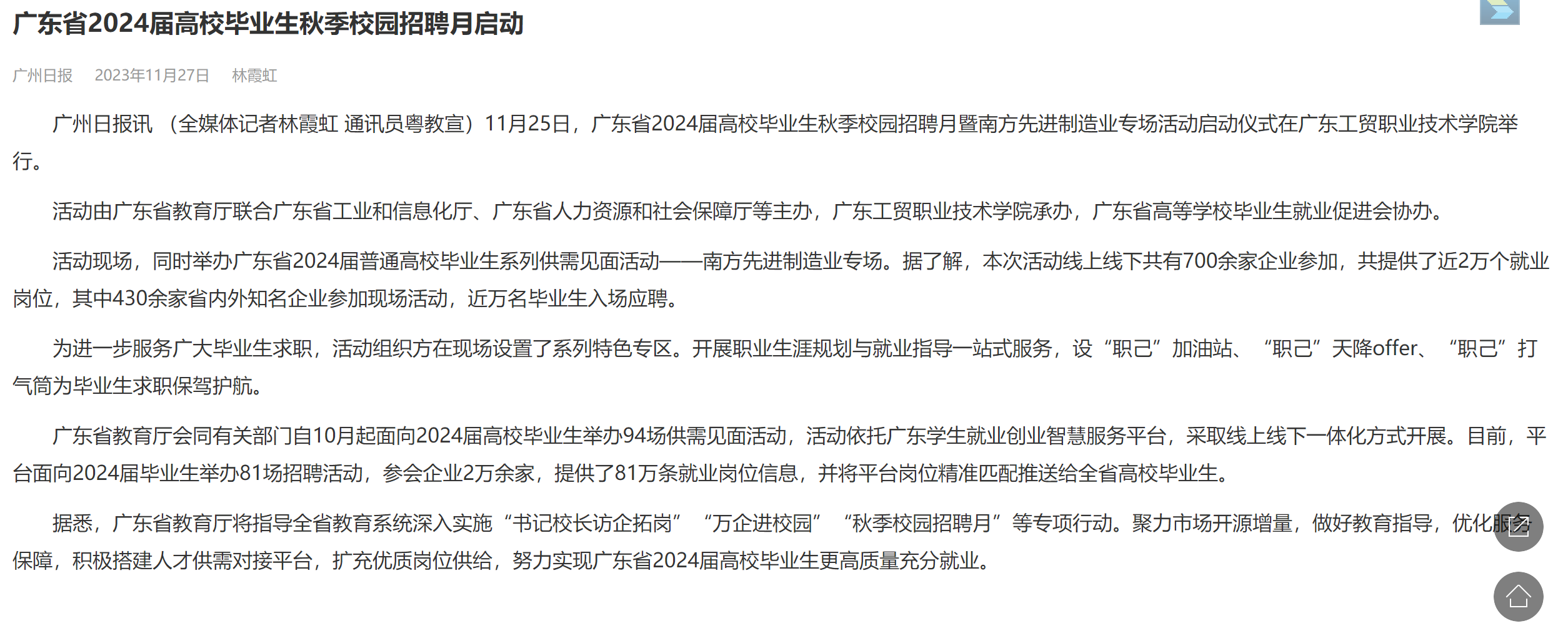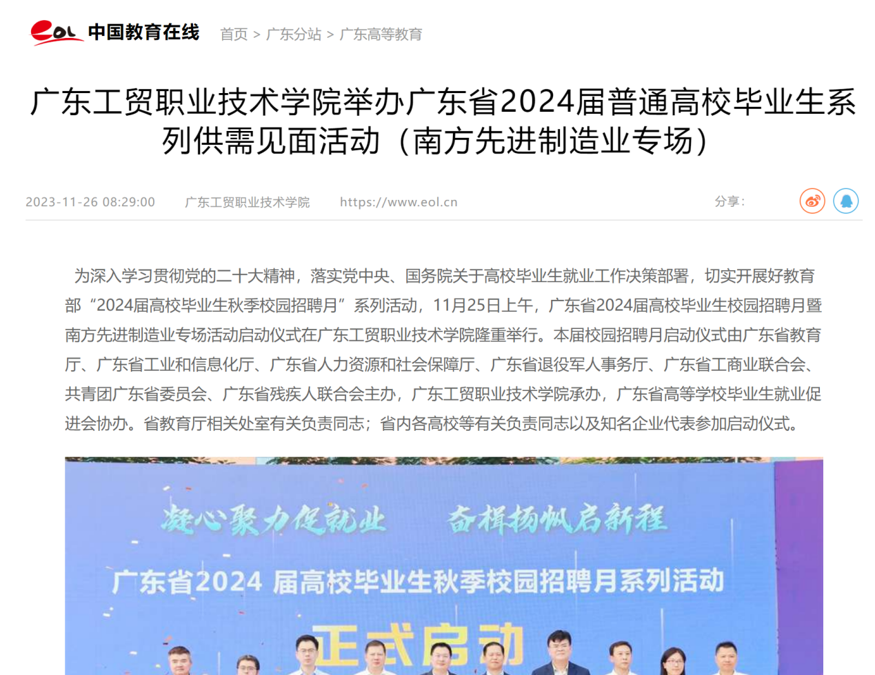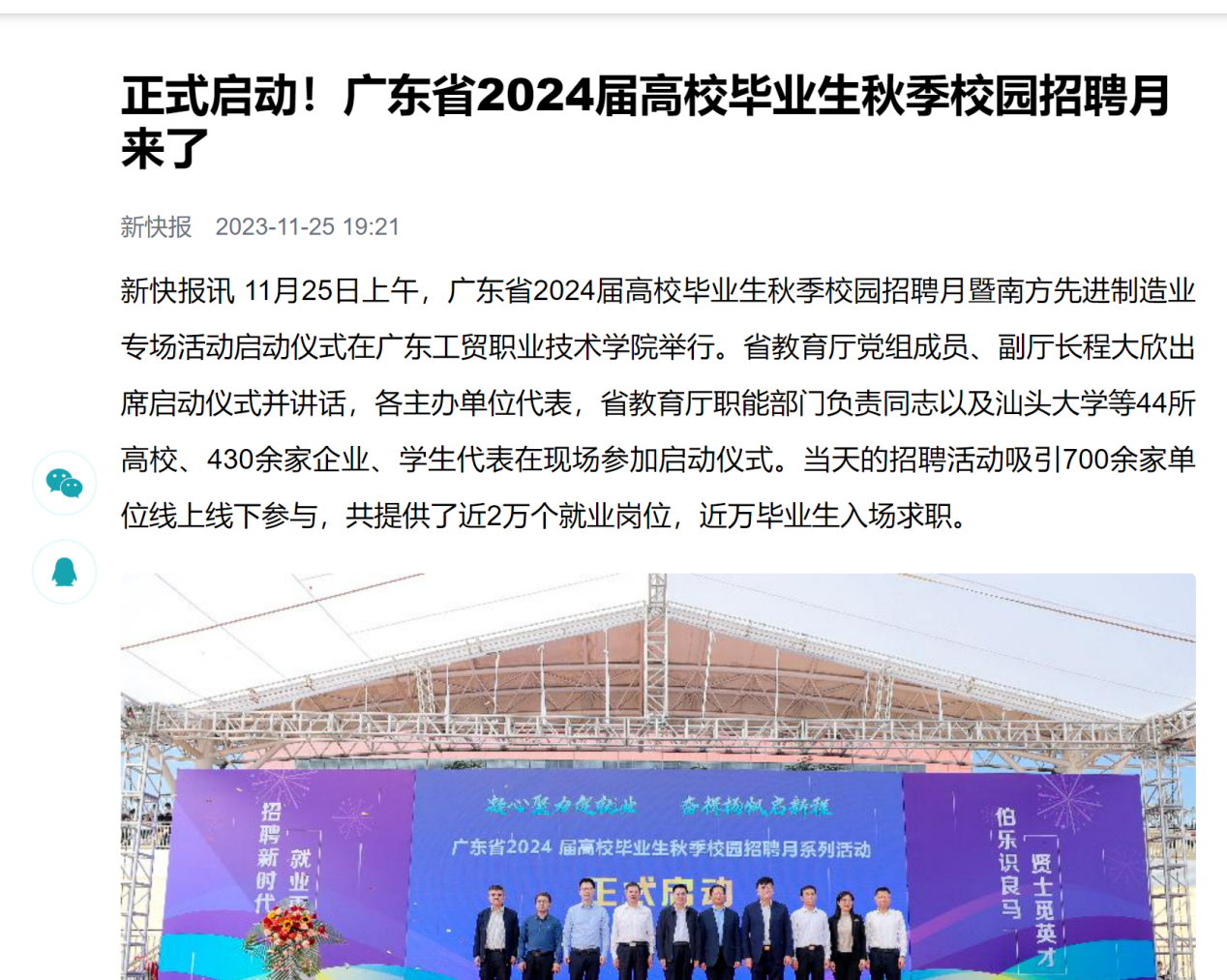 11月25日上午,广东省2024届高校毕业生秋季校园招聘月暨南方先进制造业专场活动启动仪式在菲律宾亚星222官网举行。
