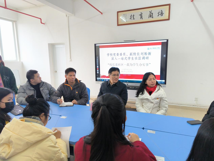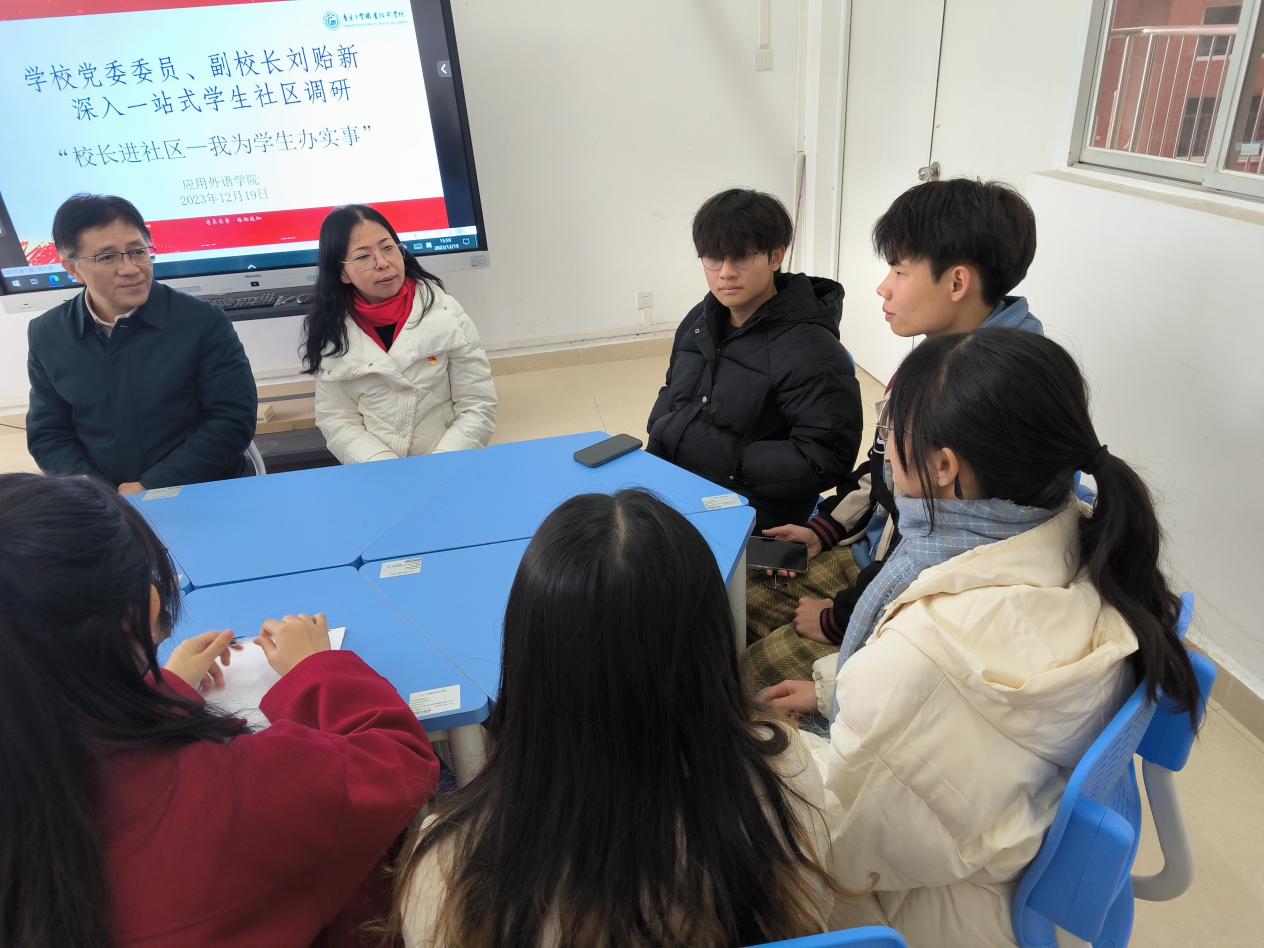 为进一步落实立德树人的根本任务,也进一步探索“一站式”学生社区综合管理模式,更是为了全面了解学生的思想、学习及生活状态,从切实维护学生的切身利益出发,推进学校教育事业高质量发展。12月19日下午,应用外语学院在16栋2楼辅导员工作室开展了主题为“校长进社区——我为学生办实事”的座谈会。学校党委委员、副校长刘贻新、应用外语学院党总支临时负责人罗春科、学院院长彭枚芳,学院学工办主任林耀佳参加会议,应用外语学院三个年级九位学生代表参加座谈交流。