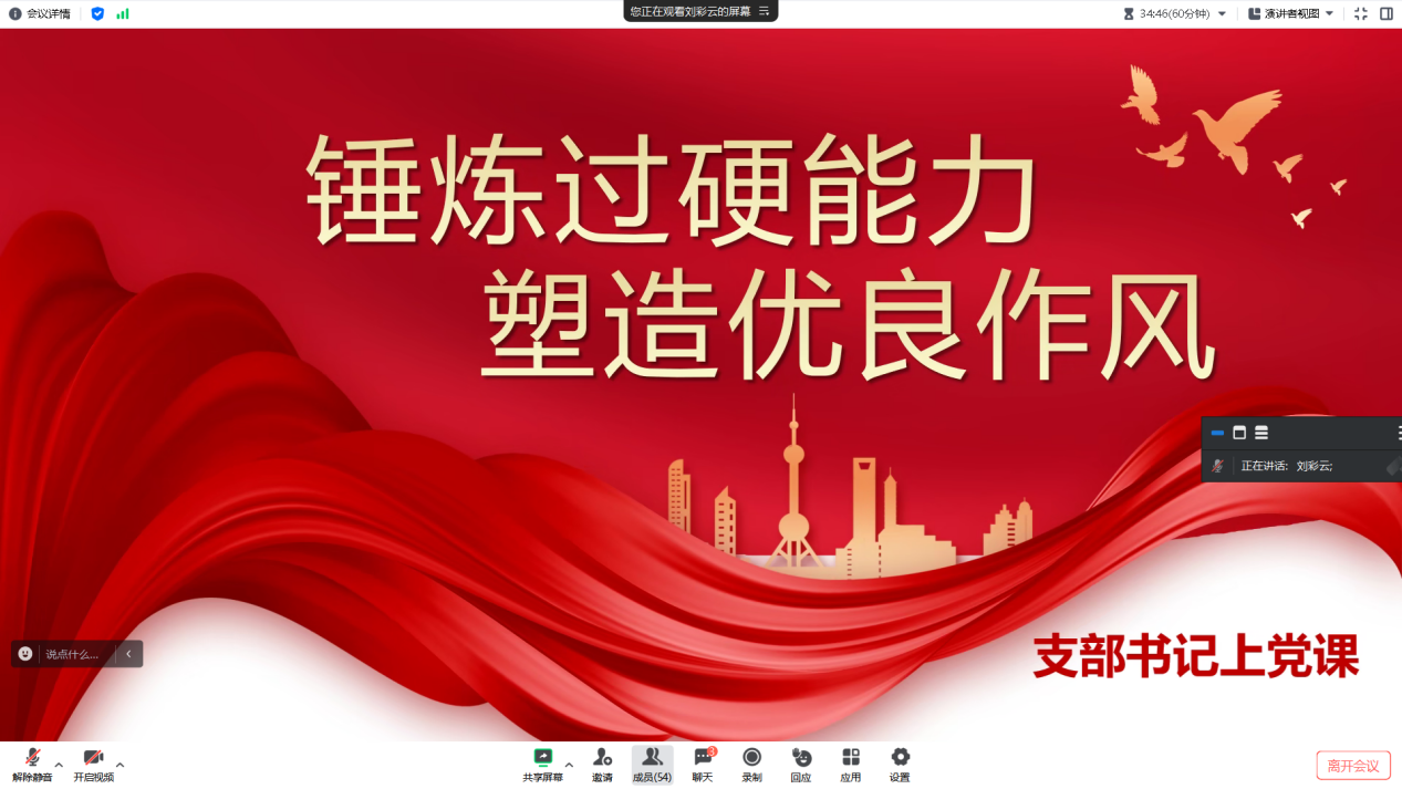刘彩云同志以习近平总书记在二十届中央纪委二次全会上的讲话作为引入,从“思想是行动的先导”、“作风问题本质上是党性问题”、“作风与能力是干事成事双保险”、“作风建设永远在路上”四个部分进行讲解。她提出,高度重视作风能力建设是我们党的优良传统和一贯做法,是新时代全面从严治党的重要内容,我们党员要时刻保持“本领恐慌”的警醒,通过不断学习克服本领恐慌,坚持原则、净化生活圈、严格要求自身,用过硬的作风和超强的能力干实事。