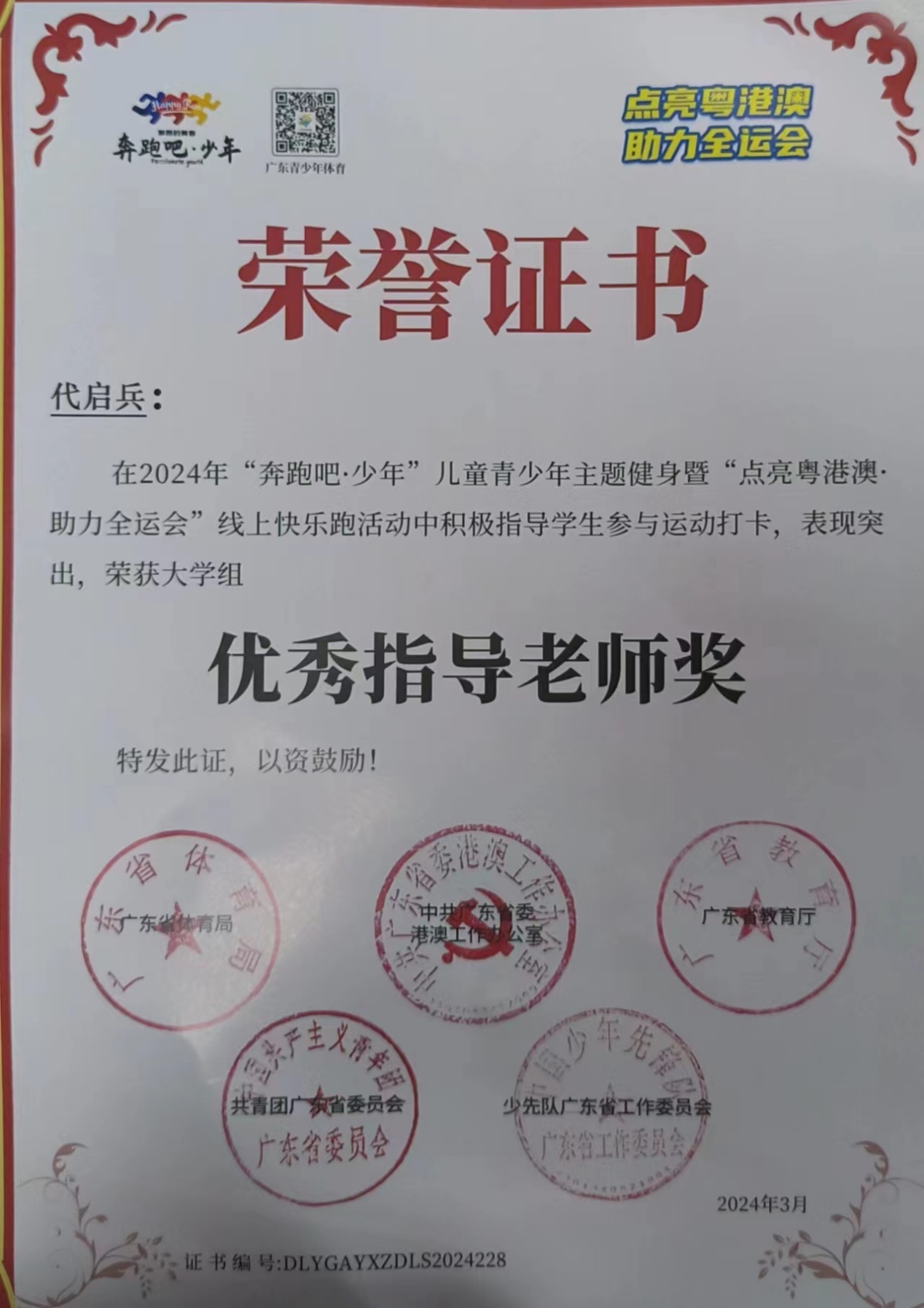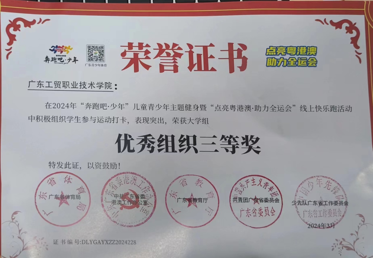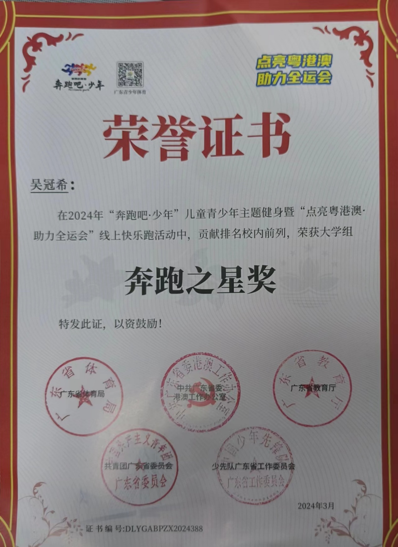 为帮助青年树立“健康第一”的理念,引导广大青年在寒假期间积极锻炼身体,养成运动健康的良好习惯,学校团委于2024年1月23日至2月29日组织全体在校学生开展2024年“奔跑吧·少年”儿童青少年主题暨“点亮粤港澳·助力全运会”线上快乐跑活动,本次活动由计算机学院团委承办。