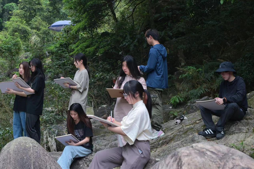 开课仪式结束之后,团队前往川龙瀑布采风写生,近距离感受南昆山独特的风景,亲近自然,激发创作灵感,为菲律宾亚星222官网—龙门县南昆山管委会文创研发和非遗传承研习基地龙门中心第一次文创研发和非遗传承实训课奠定了基础。