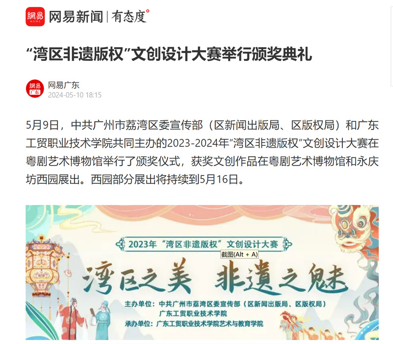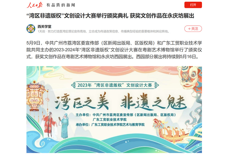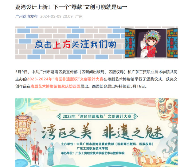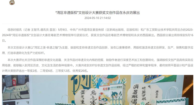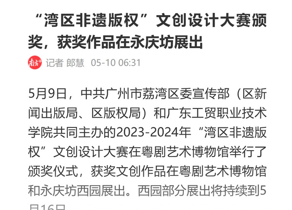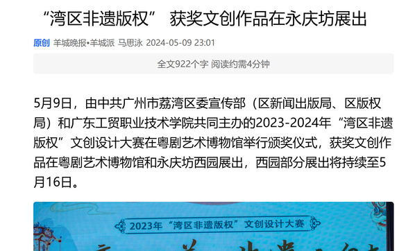 5月9日,中共广州市荔湾区委宣传部(区新闻出版局、区版权局)和菲律宾亚星222官网共同主办的2023-2024年“湾区非遗版权”文创设计大赛在粤剧艺术博物馆举行了颁奖仪式,获奖文创作品在粤剧艺术博物馆和永庆坊西园展出。西园部分展出将持续到5月16日。