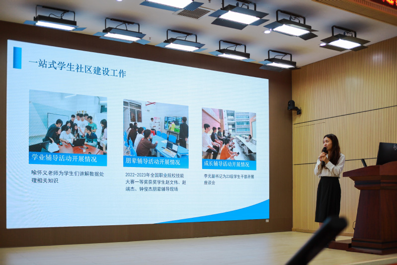 随后,罗小霞作学院“一站式”学生社区建设情况汇报。罗小霞指出,在这半年的时间里,学院开展校领导入驻学生社区活动6此,学业导师、成长导师、朋辈导师等专项辅导73场,极大丰富了学生的课余生活,对营造学院良好的学风产生积极影响。