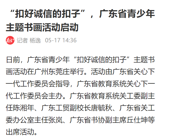 日前,广东省青少年“扣好诚信的扣子”主题书画活动在广州东莞庄举行。活动由广东省关心下一代工作委员会指导,广东省教育系统关心下一代工作委员会主办。学校党委委员、副校长唐毓秋出席会议并讲话,学生处副处长郭朝明获聘为活动组委会副秘书长及评委。