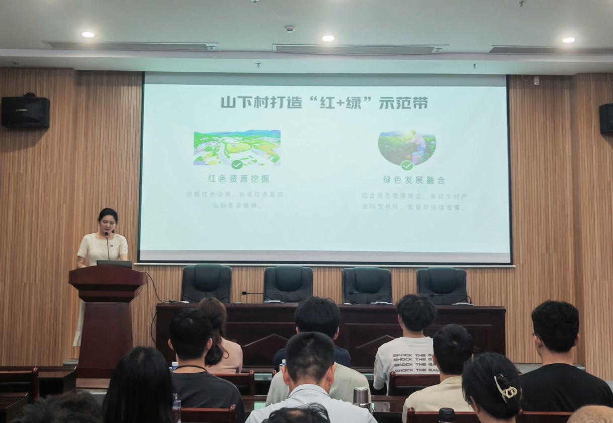 张倩倩老师围绕乡村振兴战略背景、乡村振兴三步走目标、乡村五大振兴、振兴乡村不负青春四个方面为在场师生展开实践教学。她首先和听课师生们一起学习了习近平总书记关于全面推进乡村振兴是新时代建设农业强国的重要指示精神,随后结合现场教学所在地——龙门山下村的发展带领大家领悟精神、落实行动。近年来山下村以深入实施“百县千镇万村高质量发展工程”为契机,立足自身红色资源禀赋以及优越的生态优势,致力打造一条“红+绿”旅游路线,为乡村振兴注入新动力。同时,山下村作为“红色村”的典型模范,始终深入学习习近平总书记关于“三农”工作的重要论述,贯彻落实党的二十大精神,大兴落实之风,全面推进乡村产业振兴、人才振兴、文化振兴、生态振兴和组织振兴,加快实现农业农村现代化,为高质量发展奠定坚实基础。